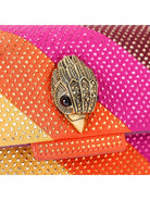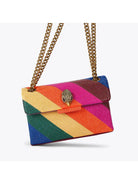 KURT GEIGER bag crafted from suede with a diagonal rainbow stripe pattern, topped with multicolored crystals. The antiqued brass eagle head is embellished with matte brass crystals and black crystal eyes on the front flap.