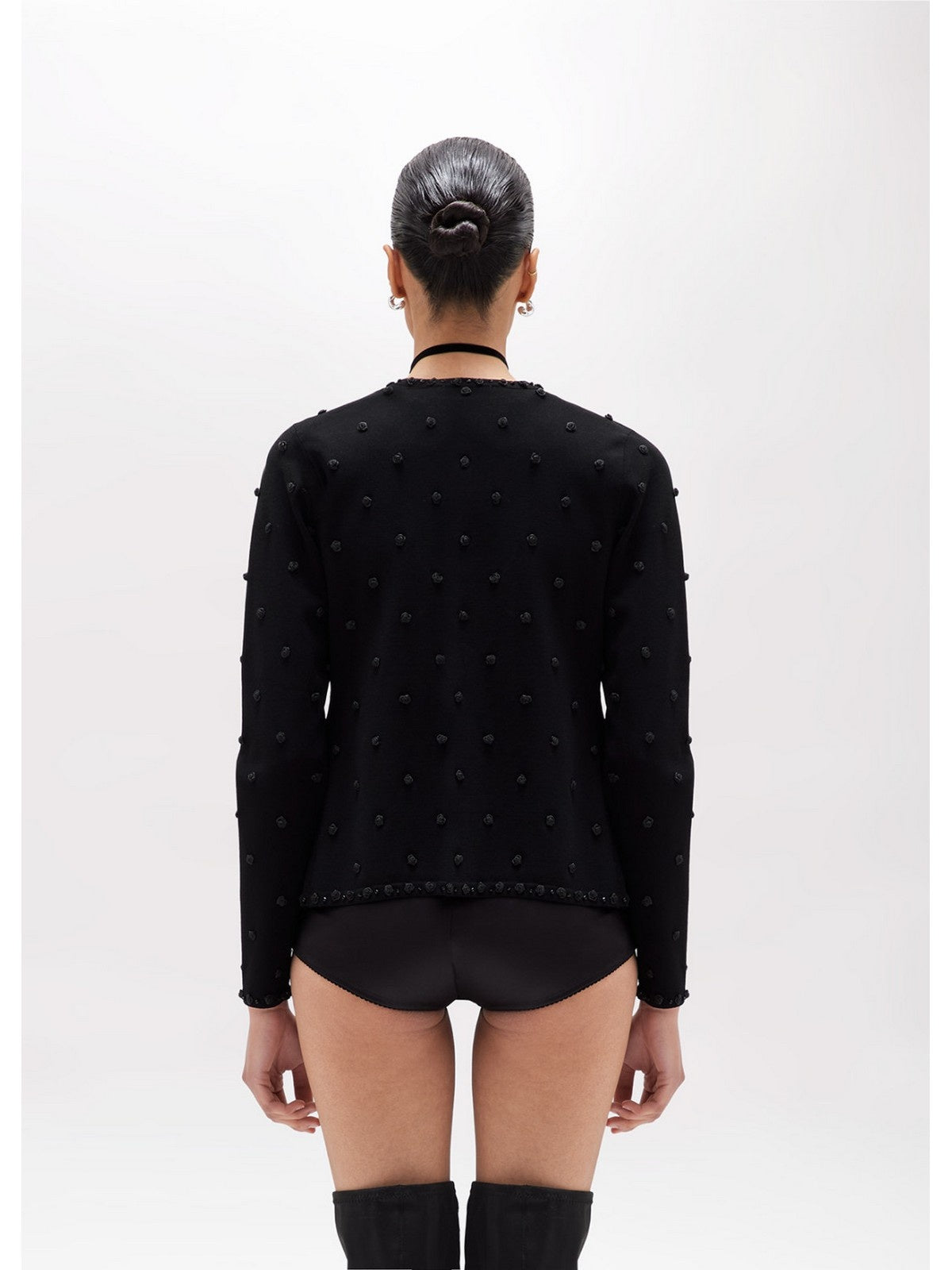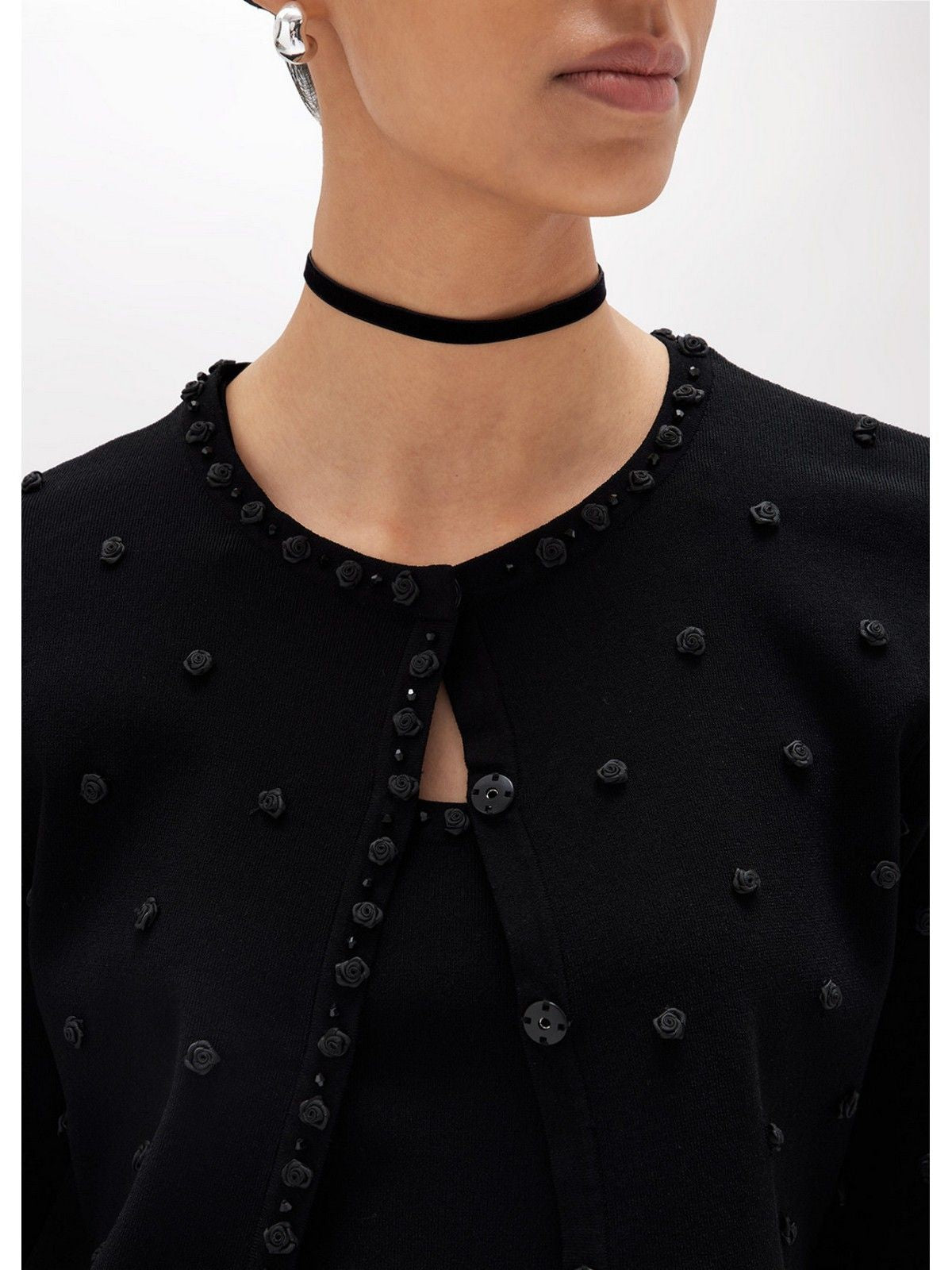 ICONIC ELEGANCE FOR THIS VISCOSE KNIT TWIN-SET EMBROIDERED WITH HAND-APPLIED SATIN ROSES AND PIPING INTERSPERED WITH ROSES WITH MATCHING CORALS. THE STRAIGHT-FIT CARDIGAN FASTENS WITH SNAPS, A ROUND NECK, AND LONG SLEEVES. THE TOP HAS A FITTED LINE AND A WIDE NECKLINE. TO BE INTERPRETED IN A MYRIAD OF SPECIAL LOOKS. COMPOSITION: 83% VISCOSE 17% POLYESTER