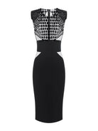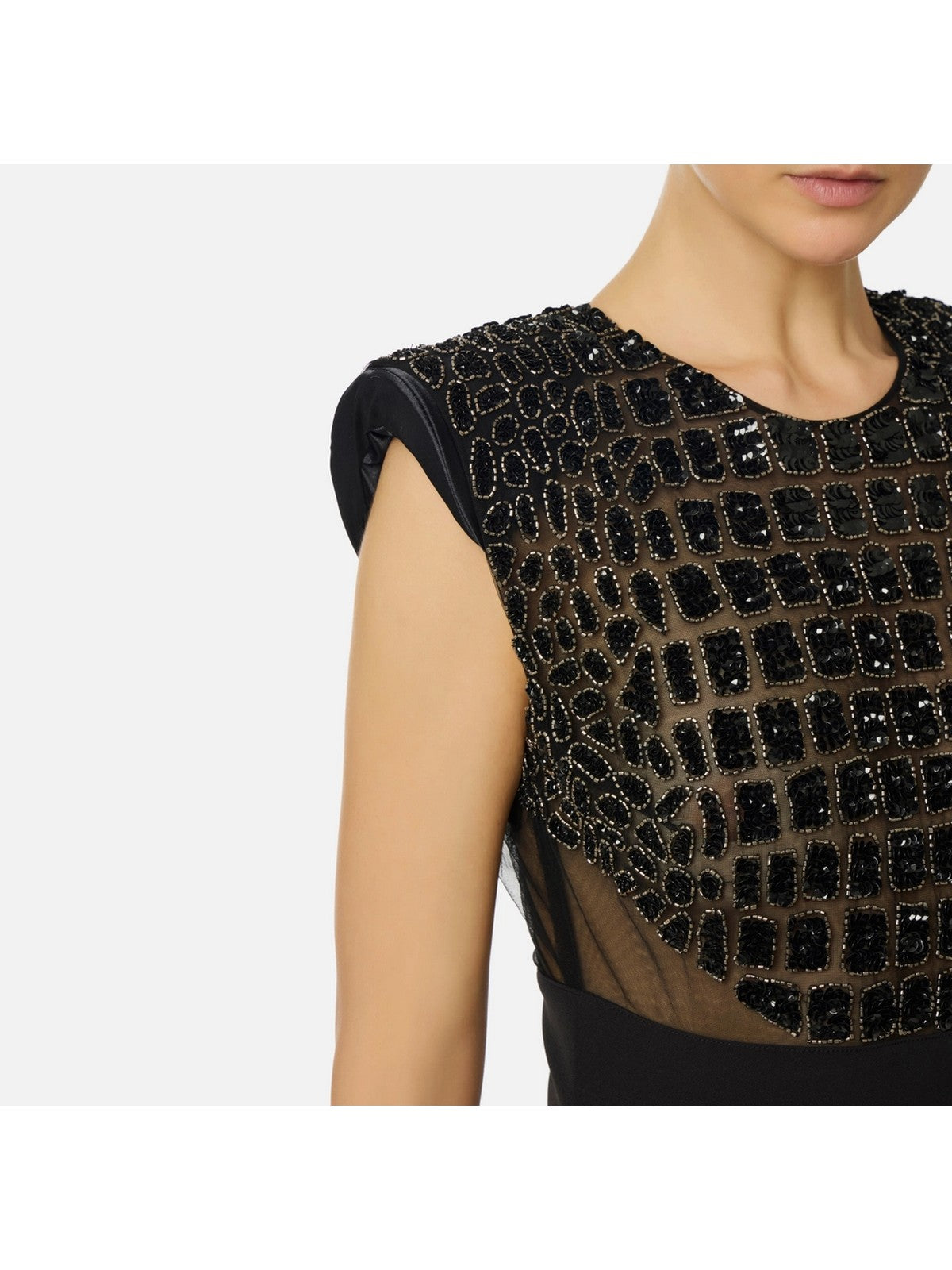 ELISABETTA FRANCHI midi dress in light crepe, top embellished with brilliant embroidery with a coconut design.