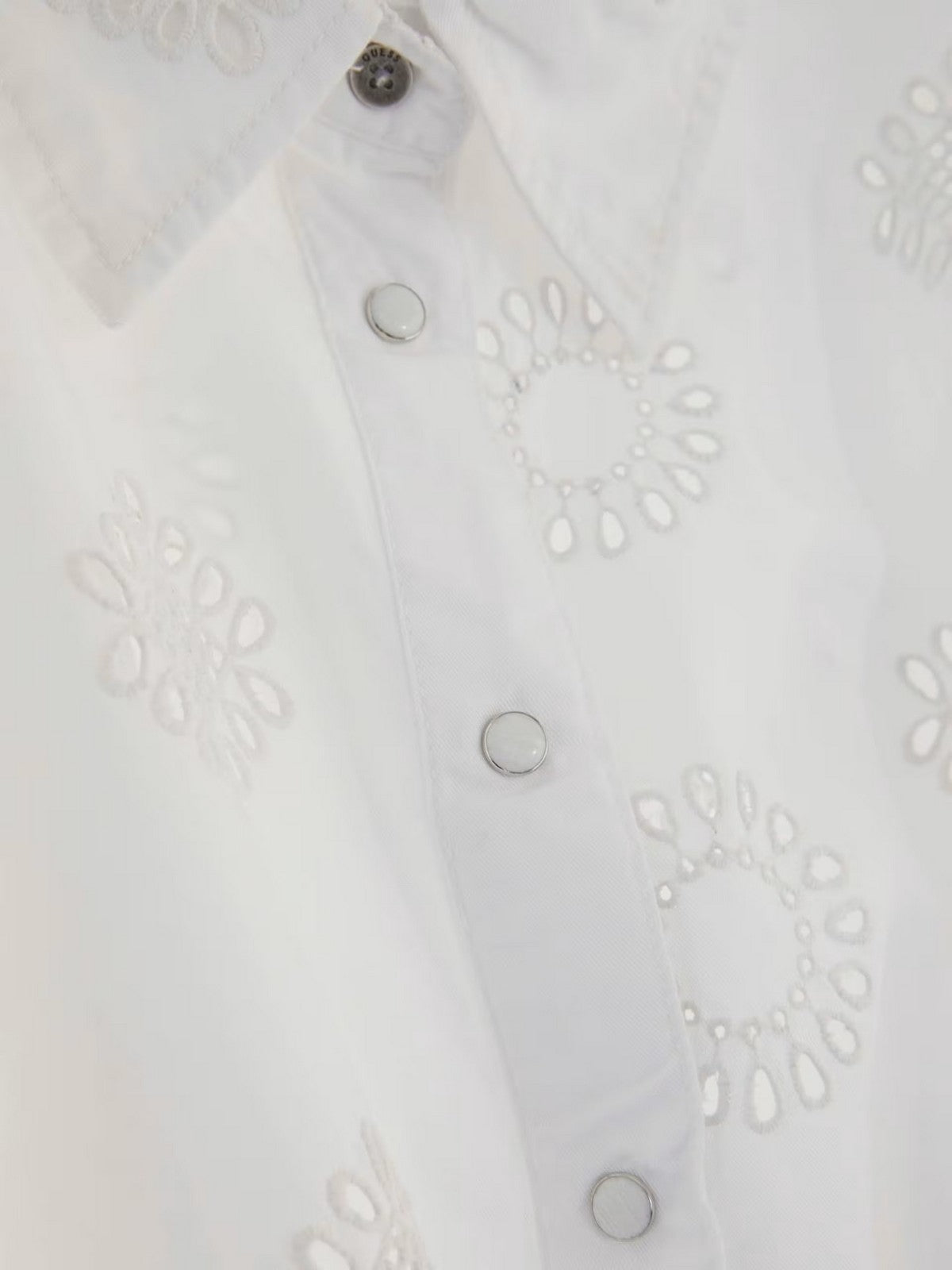 GUESS Lyocell Shirt. All-over embroidery. Classic collar and short sleeves. Front knot. Button closure.