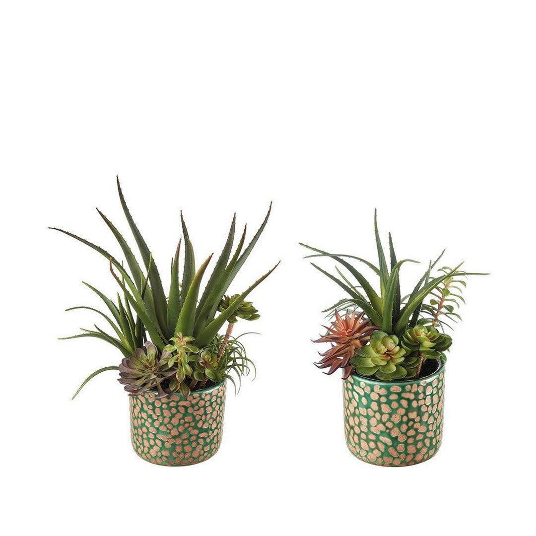 Set of two green ceramic vases with a composition of different types of artificial succulents. The textured finish of the vases harmonizes perfectly with the floral composition for lovers of Ethno Chic furniture.