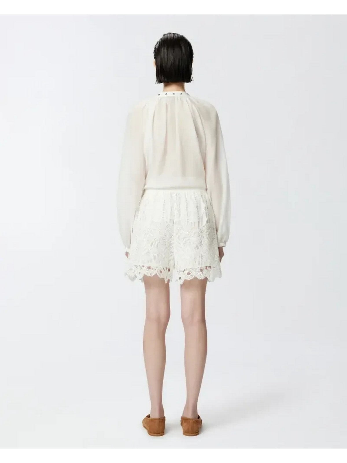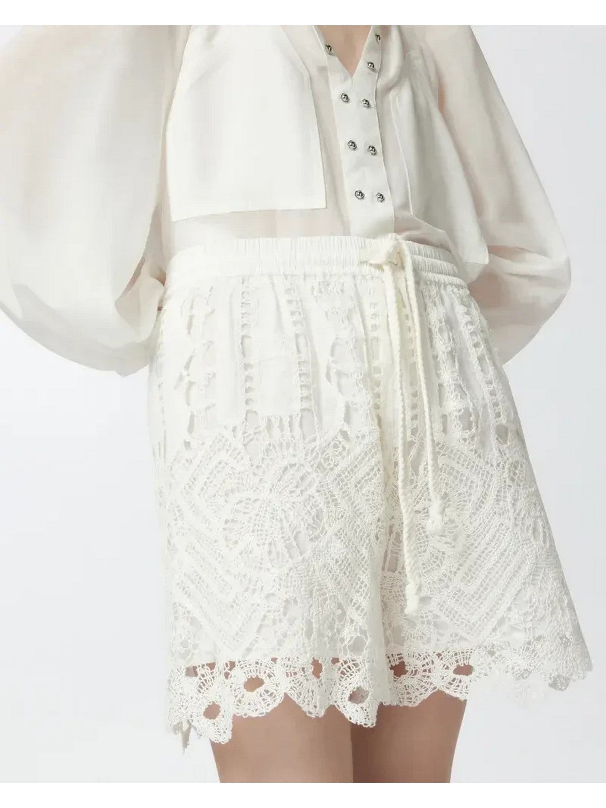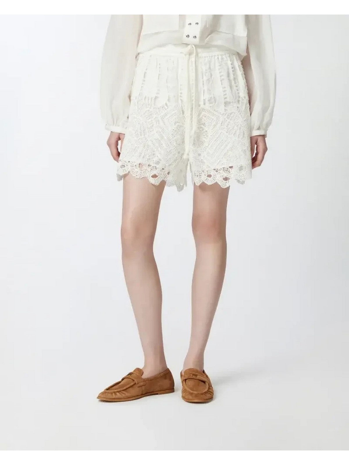 Daytime shorts in refined broderie anglaise with macramé details, which together create a distinctive openwork design that continues down the length of the leg, creating a scalloped hem at the bottom. These summery and feminine shorts are finished with a cotton lining that reduces the transparency of the openwork pattern created by the fabric and provides a cool sensation against the skin. The high waist with a relaxed crotch, elastic waistband, and drawstring ensure a perfect fit. The refined workmanship and lightweight fabric make these shorts the perfect piece for even the hottest city days.