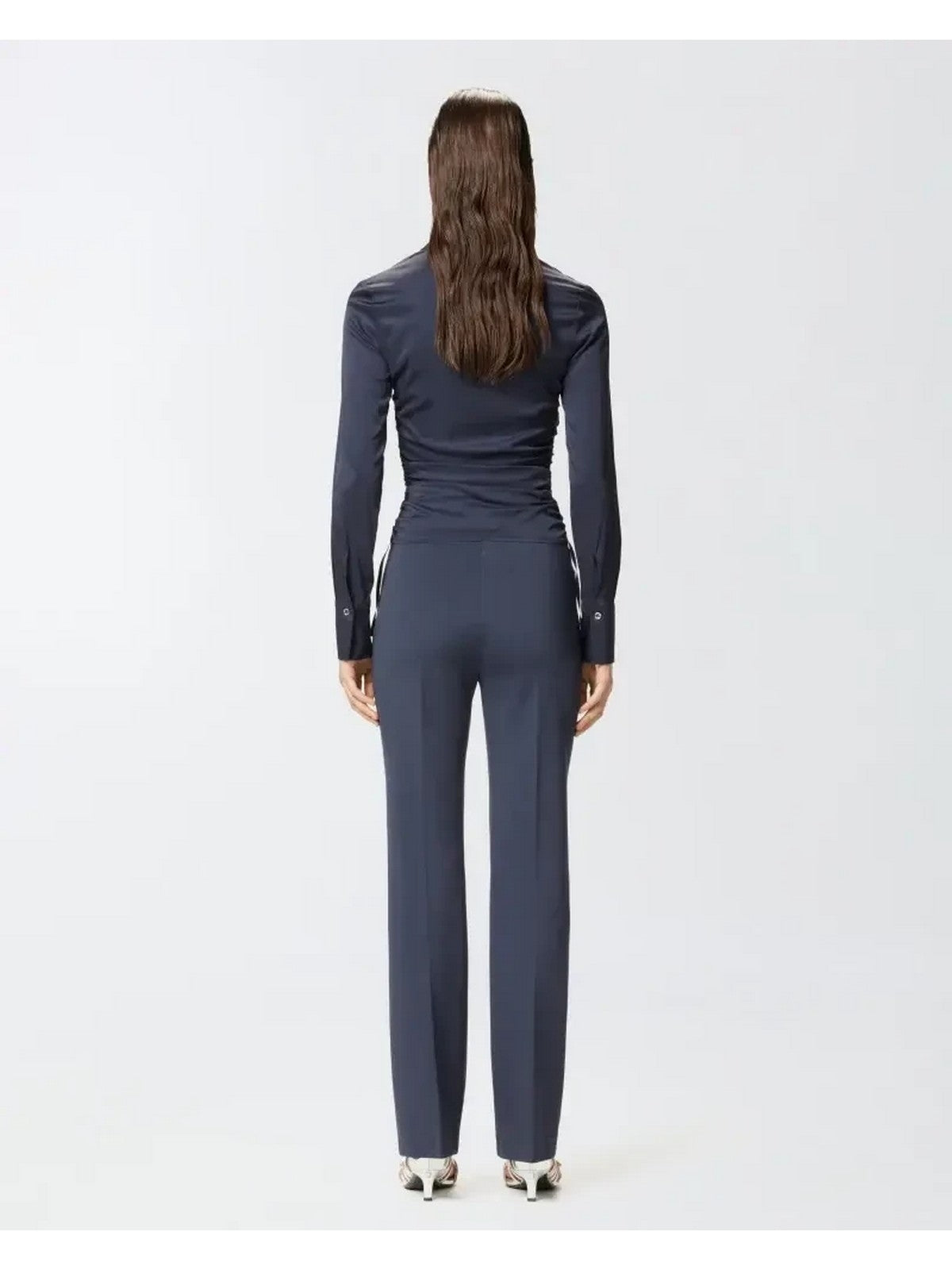 Women's long trousers in technical stretch viscose fabric with a scuba-look knit, featuring a distinctive compact and slightly shiny texture, made with 60% viscose from responsibly managed forests. The high-waisted trousers, fitted to the mid-leg and flaring towards the hem, feature side pockets and a button and concealed zip closure in the front. These trousers are perfect for the office with a matching blazer or anywhere you want to add a touch of sophistication, paired with a particularly feminine blouse or top.