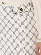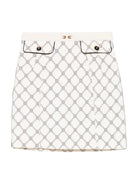 This mini skirt is designed to enhance the silhouette with modern elegance. The design is embellished with a refined jeweled horsebit with enamel logo, strategically positioned on the waistband for a distinctive touch. The contrasting piping details add definition to the garment, while the gold metal ring buttons recall a sophisticated and timeless style. An ideal choice for those seeking the perfect balance between class and femininity.