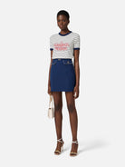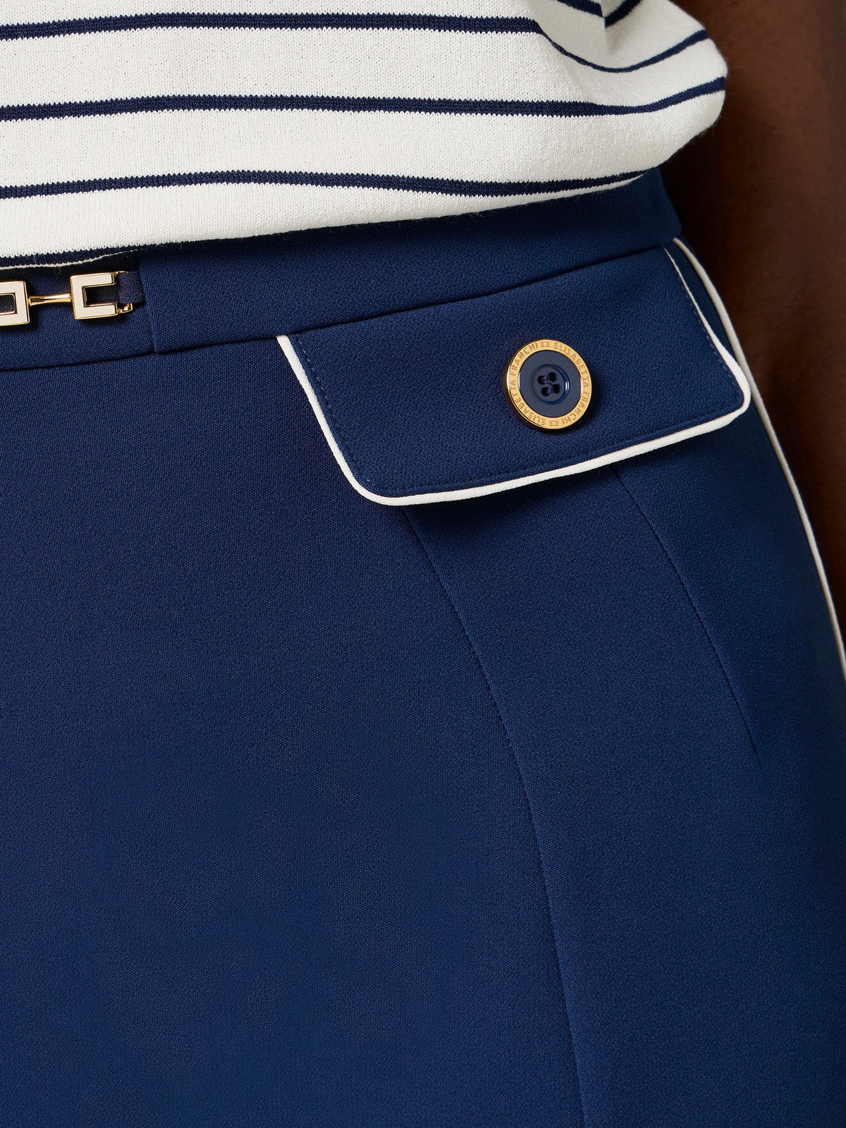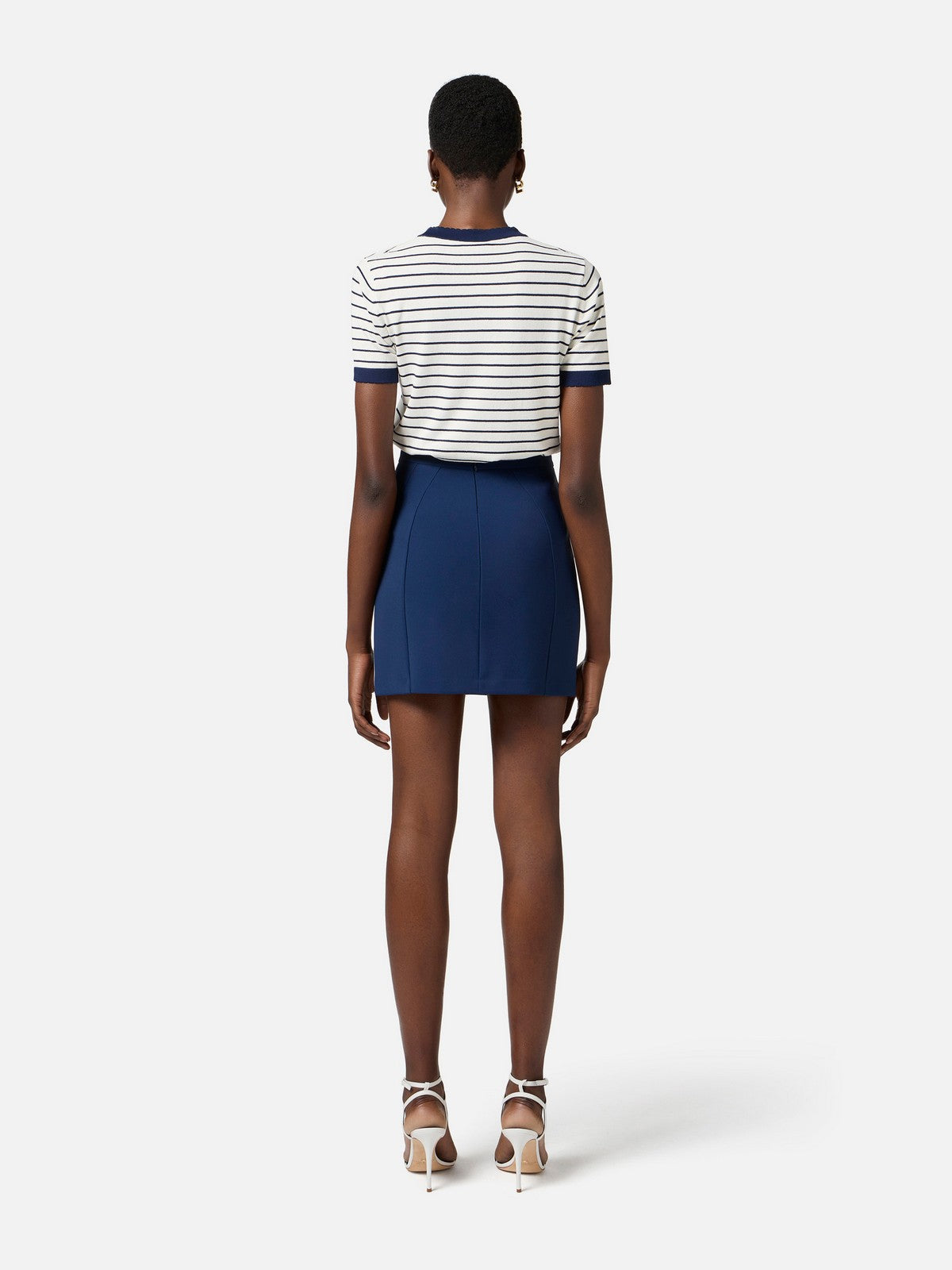 This mini skirt is designed to enhance the silhouette with modern elegance. The design is embellished with a refined jeweled horsebit with enamel logo, strategically positioned on the waistband for a distinctive touch. The contrasting piping details add definition to the garment, while the gold metal ring buttons recall a sophisticated and timeless style. An ideal choice for those seeking the perfect balance between class and femininity.