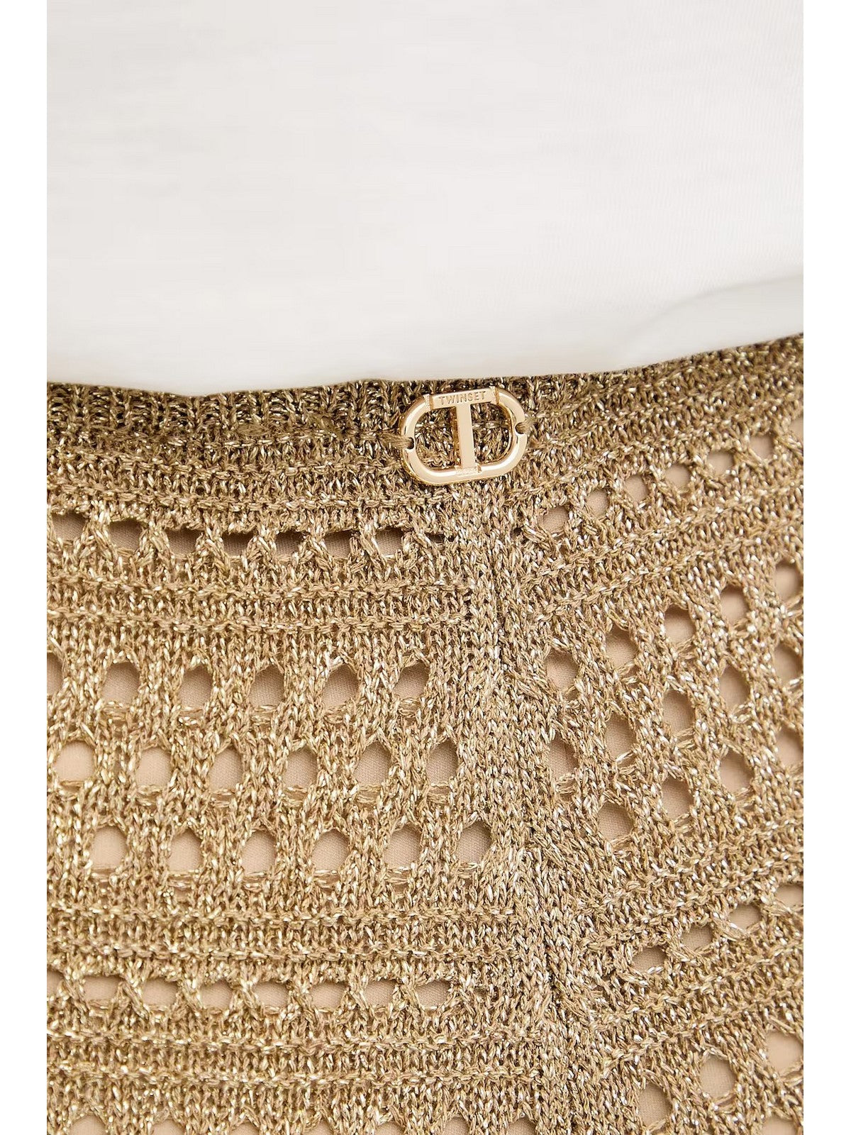 TWINSET knitted trousers in a lurex viscose blend with punched workmanship alternating with links stitches with a horizontal striped effect.