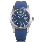 Locman Island line men's automatic watch with new two-level blue dial and seconds hand, 40mm steel case Polished and satin finish and blue silicone strap, sapphire crystal, titanium case back, water resistant to 5 bar. Time-only movement with date display. Code 0615A02A-00BLNKSB