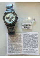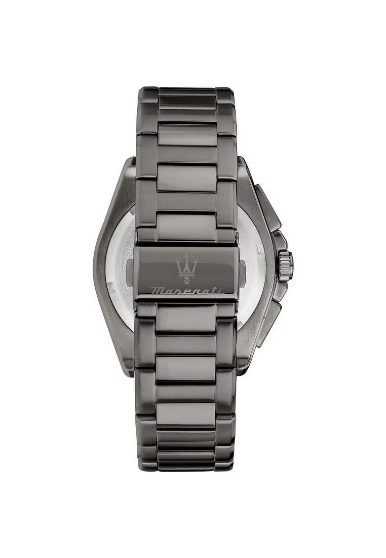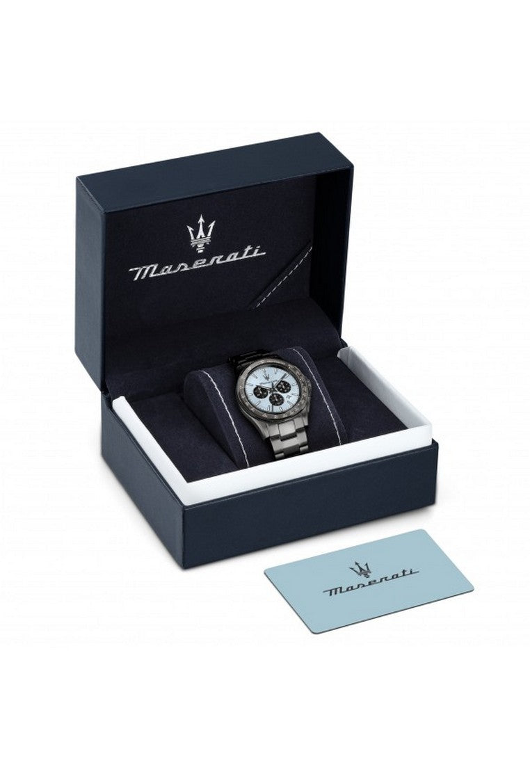 Men's watch from the Maserati brand, the timepiece has a Quartz Chronograph mechanism with the month date at 4 o'clock, the case measures 43 mm in burnished steel, the dial is light blue with steel hands and indexes, the strap is in steel with a satin finish, the bezel is fixed in burnished steel with tachymeter bezel engravings, the glass is mineral, the logoed crown is screw-down, water resistance is 10 atm.