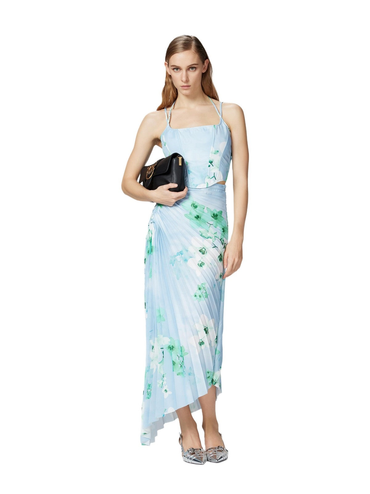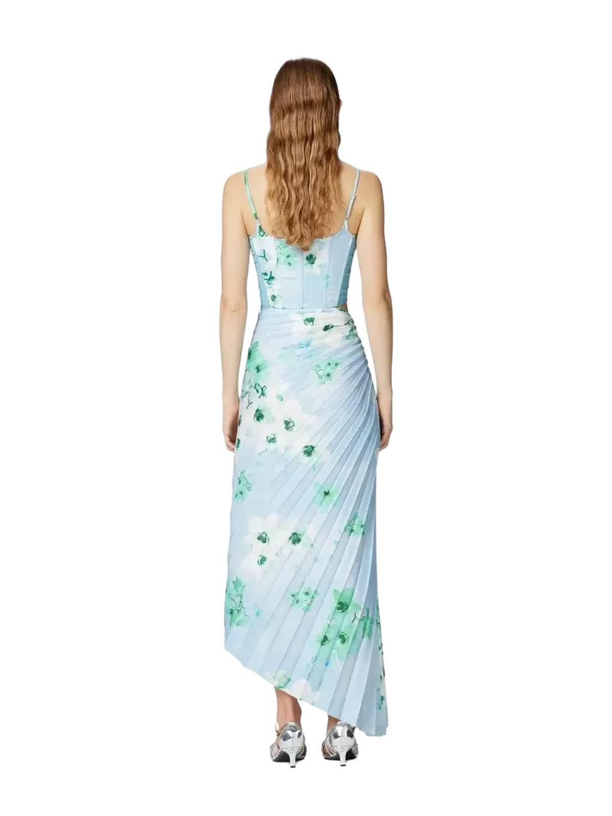 Elegant midi skirt crafted from lightweight duchesse with tightly pleated detailing and a delicate all-over floral print. The skirt's silhouette is enhanced by a gathered, gathered waist and an asymmetrical hem, longer on one side than the other. The invisible side zip makes it easy to put on. This skirt exudes the energy and beauty of spring, especially when paired with a top and jacket in contrasting colors, but always in a matching color palette.
