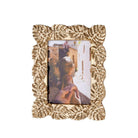 Rectangular resin photo frame. Thanks to the gold decoration and leaf motif, your most cherished memories will adorn your home with a jungle-inspired style. Also available in a smaller version.