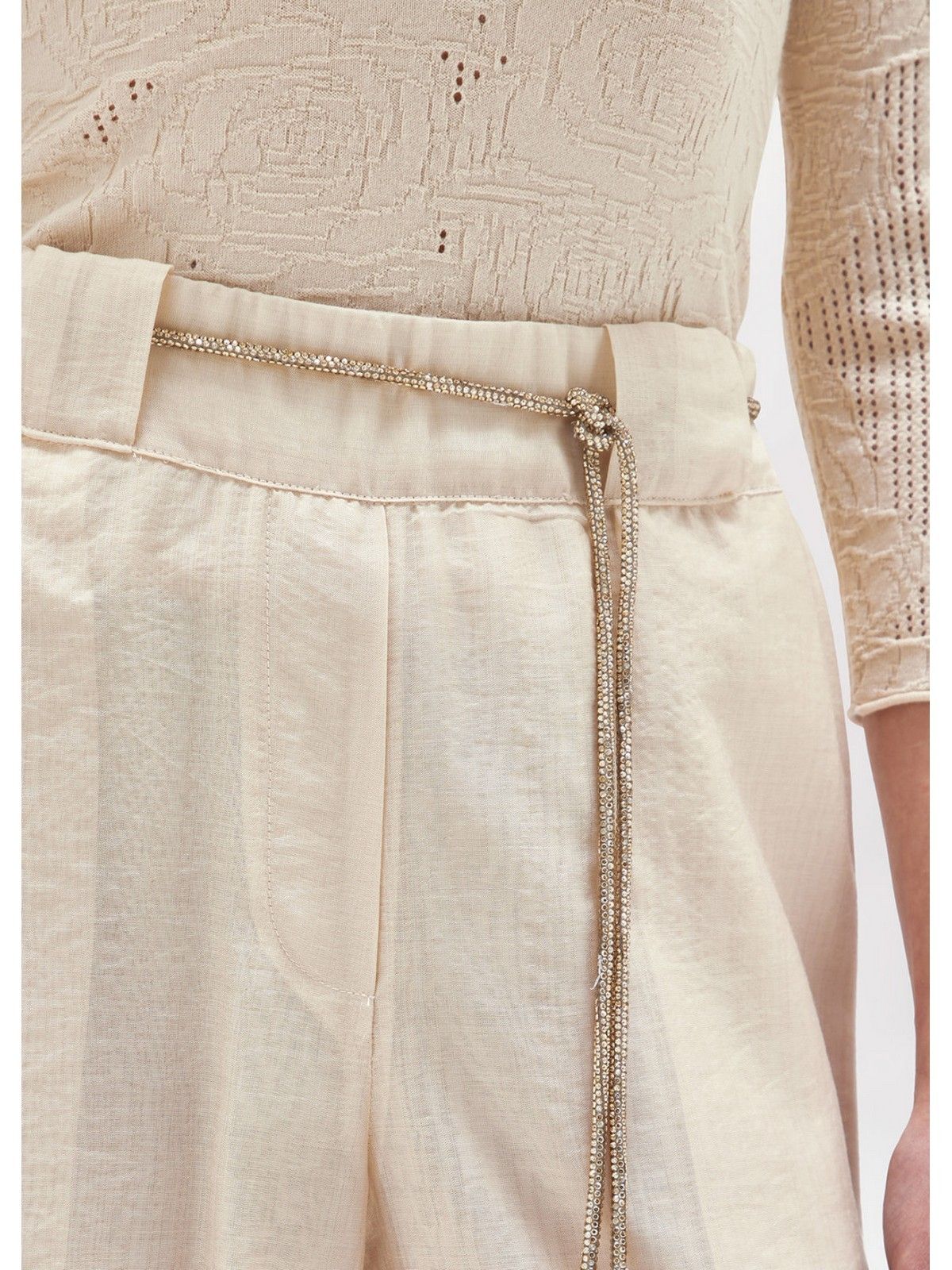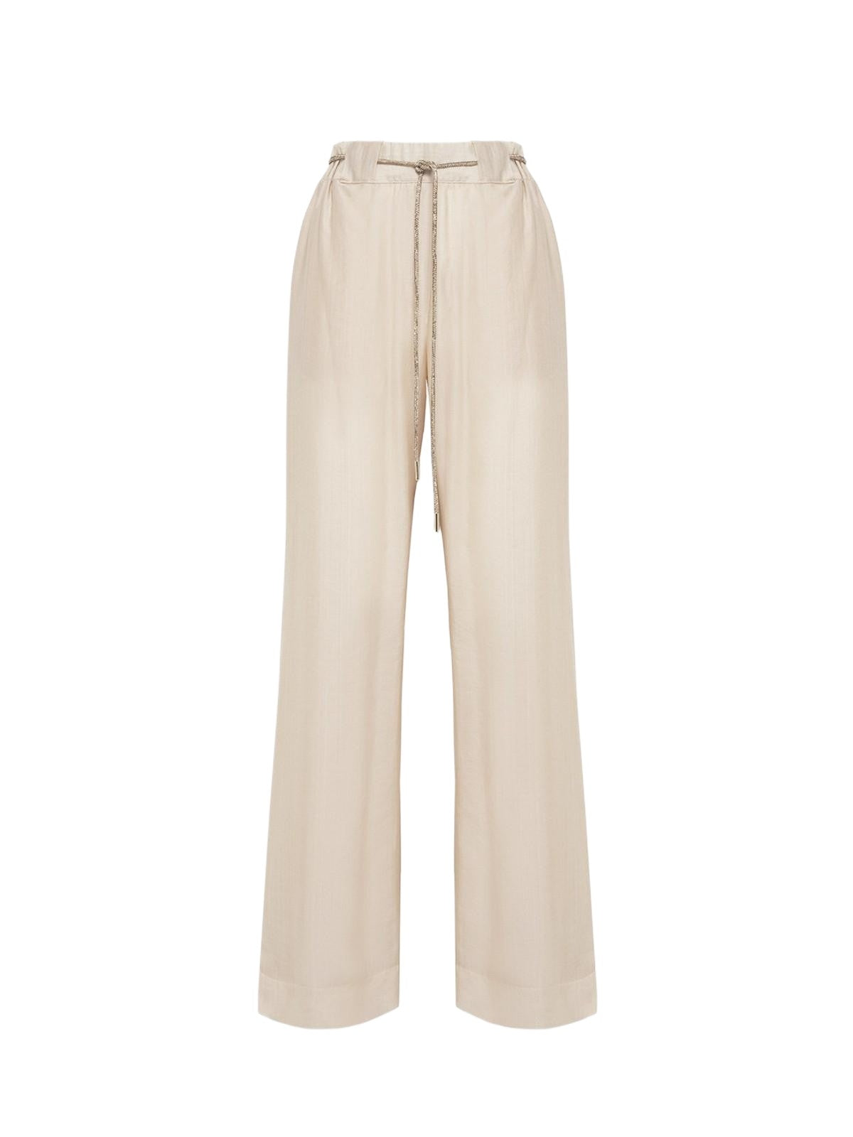 PALAZZO LINE FOR AN EXTRA-LONG SILHOUETTE EFFECT WITH THE LIGHTWEIGHT DOUBLE-LAYERED TENCEL TROUSERS. THEY FEATURE WAISTBAND LOOPS, A REMOVABLE TUBULAR BELT IN RHINESTONE COVERED IN TULLE, AND SIDE POCKETS. VERSATILE APPEAL THAT YOU CAN WEAR WITH A MATCHING SHIRT. COMPOSITION: 80% LYOCELL 20% POLYAMIDE