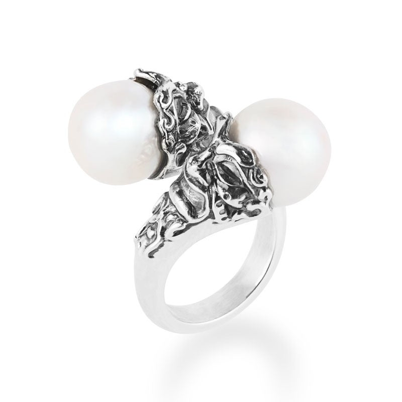L'Anello contrarié in Argento 925/000, della linea Maschere e Monete, Collezione Mito, presenta alle estremità due perle coltivate del diametro di 12mm. A caratterizzare il design di un classico intramontabile come le perle è l'elaborata lavorazione del gambo, dove le due maschere apotropaiche, talismano magno greco capace di esorcizzare gli influssi malefici, rendono unico e ricco di significato il gioiello.