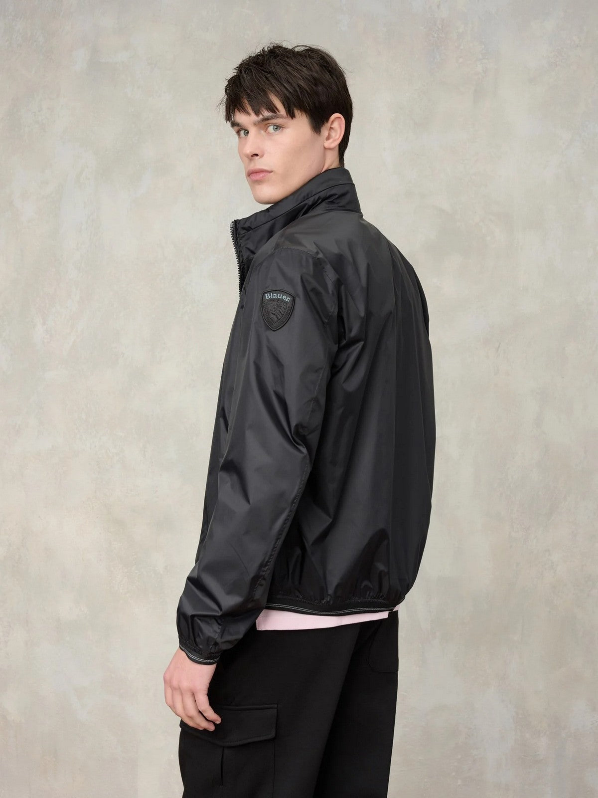 Giubbino a vento BLAUER in nylon foderata in cotone con cappuccio ripiegato e nascosto nel colletto.