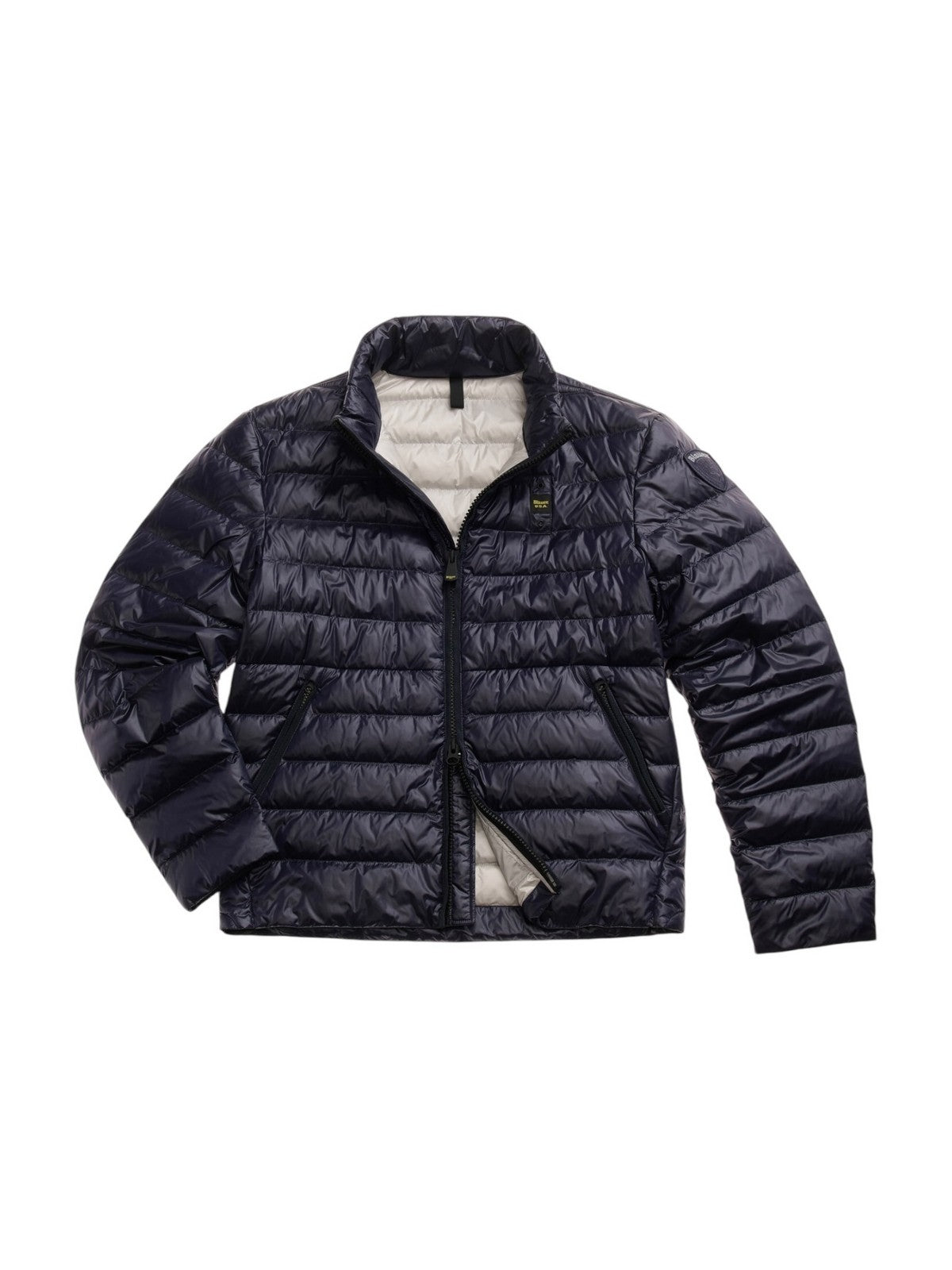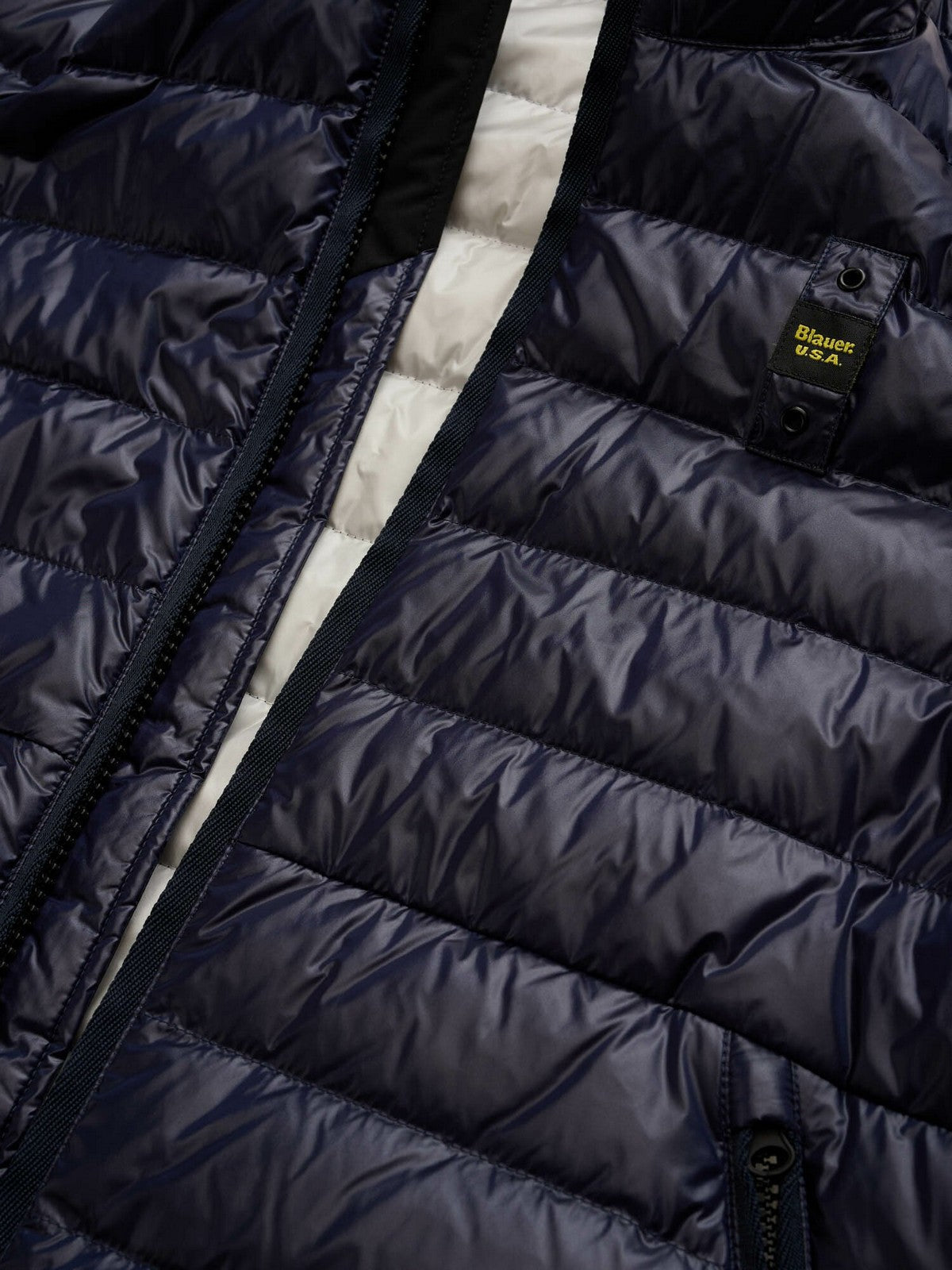 Piumino lucido BLAUER imbottito piuma e impunturato a righe orizzontali. Capo iconico della linea che non può mancare nel guardaroba.