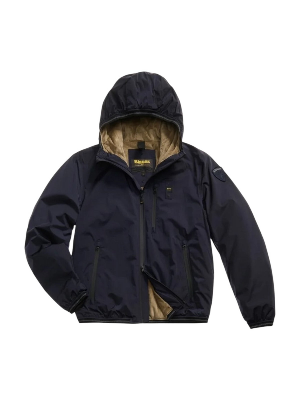 Piumino BLAUER liscio esternamente ma con pelliccia ecologica morbida e calda all'interno. Tessuto idrorepellente con cuciture interne nastrate thermofix. Capo per chi vuole rimanere coccolato anche nelle giornate piovose.