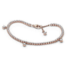 Pandora Bracciale Tennis con Gocce Luminose, esclusiva lega metallica placcata oro rosa 14k; 59 zirconia cubica incolore taglio brillante, incastonatura a griffe; 4 zirconia cubica taglio brillante in misura 18, incastonatura a griffe