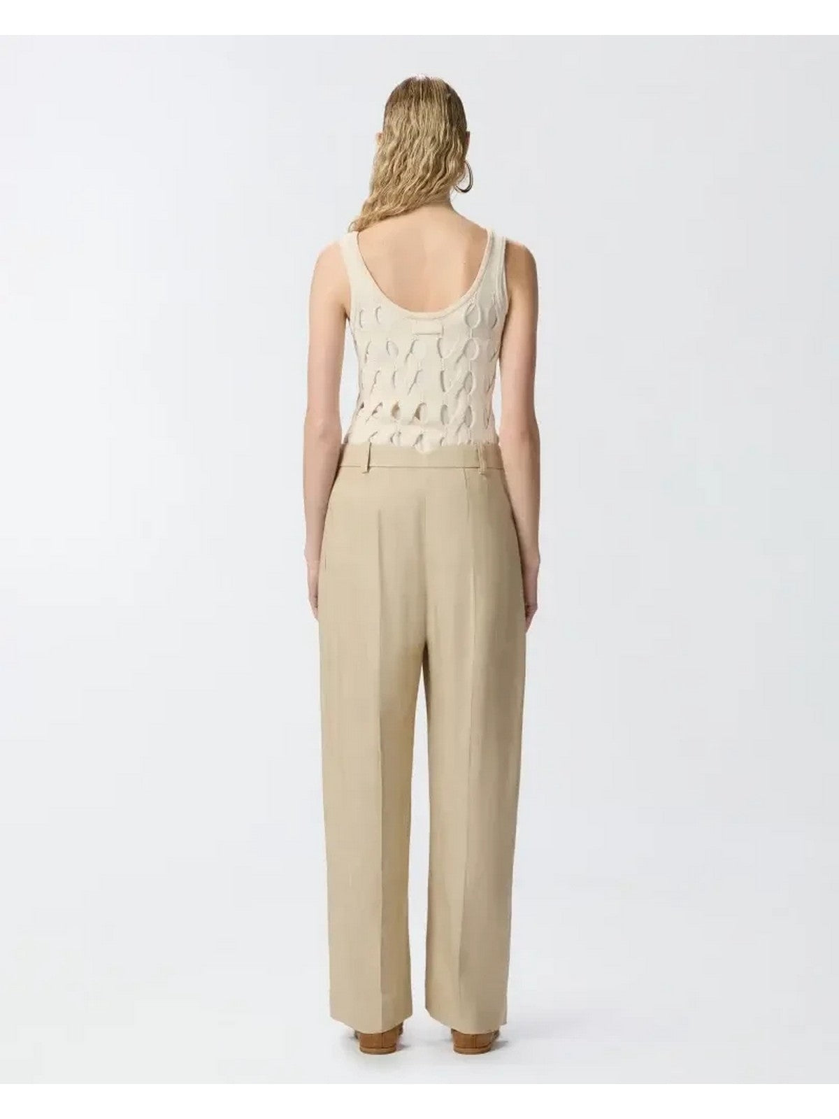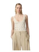 Top senza maniche dalla linea a canottiera realizzato in maglia di misto viscosa caratterizzata da una particolare lavorazione a trecce e trafori che crea un effetto con trasparenze e see-through. La canotta, rifinita con spalline e ampio scollo tondo sia davanti che sul retro, completa i tuoi look estivi con un tocco decisamente speciale e fuori dal comune.