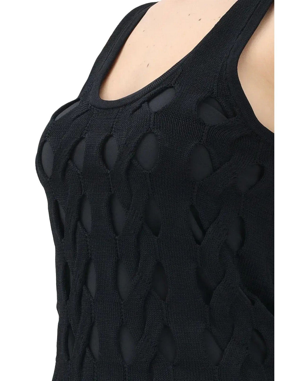 Top senza maniche dalla linea a canottiera realizzato in maglia di misto viscosa caratterizzata da una particolare lavorazione a trecce e trafori che crea un effetto con trasparenze e see-through. La canotta, rifinita con spalline e ampio scollo tondo sia davanti che sul retro, completa i tuoi look estivi con un tocco decisamente speciale e fuori dal comune.