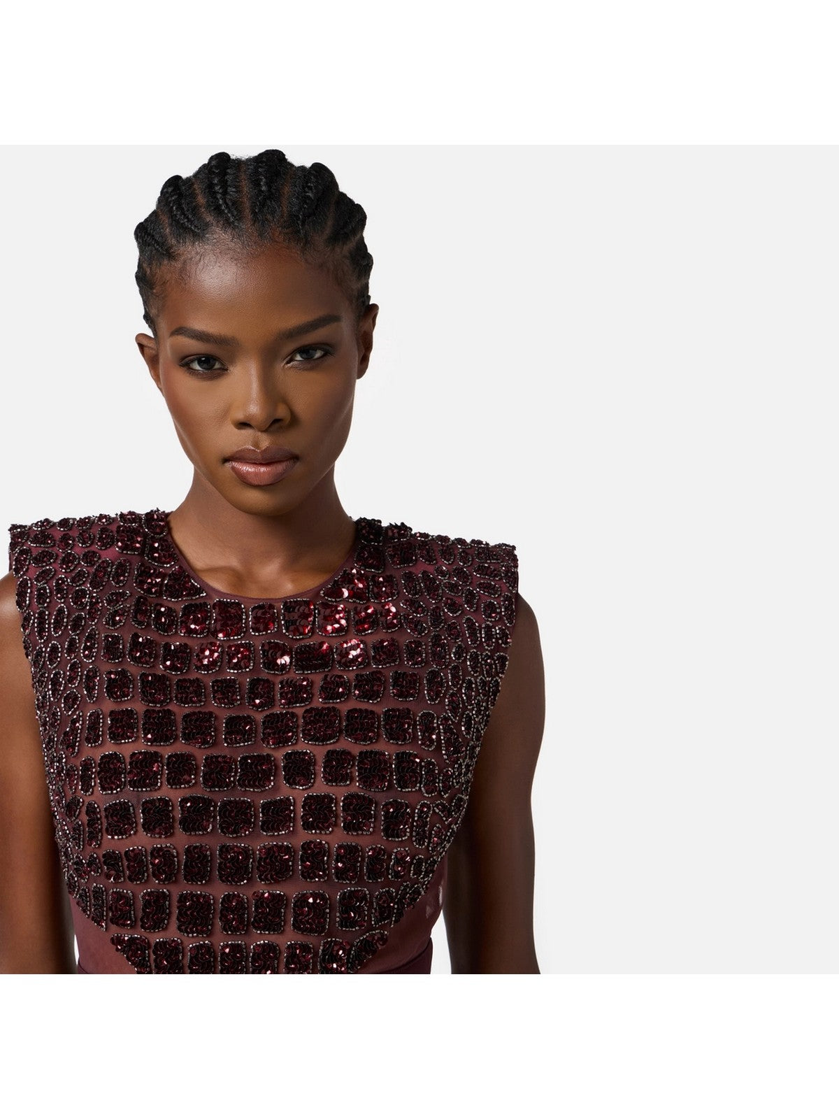 Abito midi ELISABETTA FRANCHI in crêpe leggero, top impreziosito da brillanti ricami con disegno cocco.