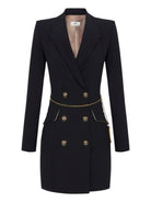 ? Bottoni e cintura in catena con logo e nappina in trama snake.