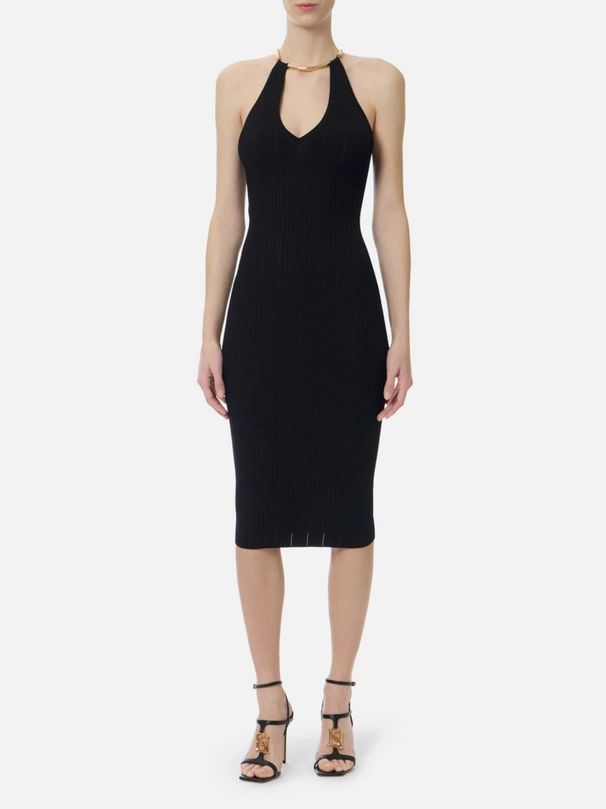 Abito ELISABETTA FRANCHI in maglia con trama a costine lisce si alterna a quella con traforatura à jour.