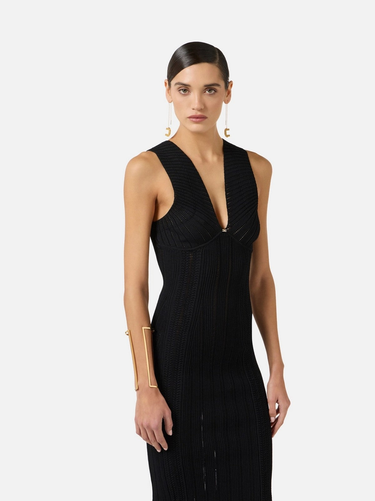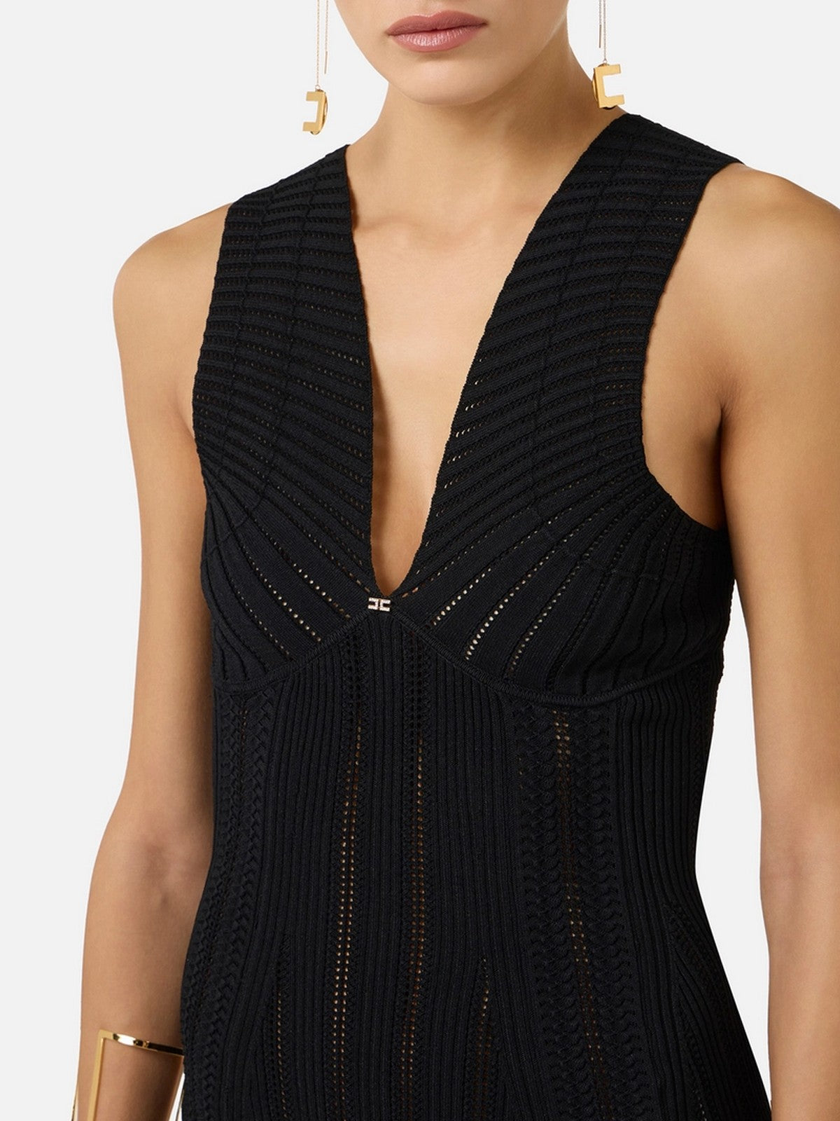 Abito in maglia ELISABETTA FRANCHI realizzato in viscosa con lavorazione con punto à jour, studiata per seguire ed esaltare le linee del corpo con traforature, trecce e disegni geometrici.