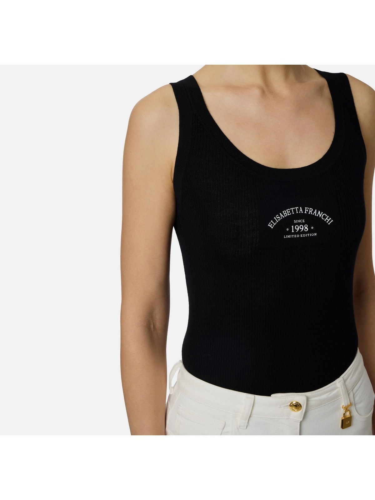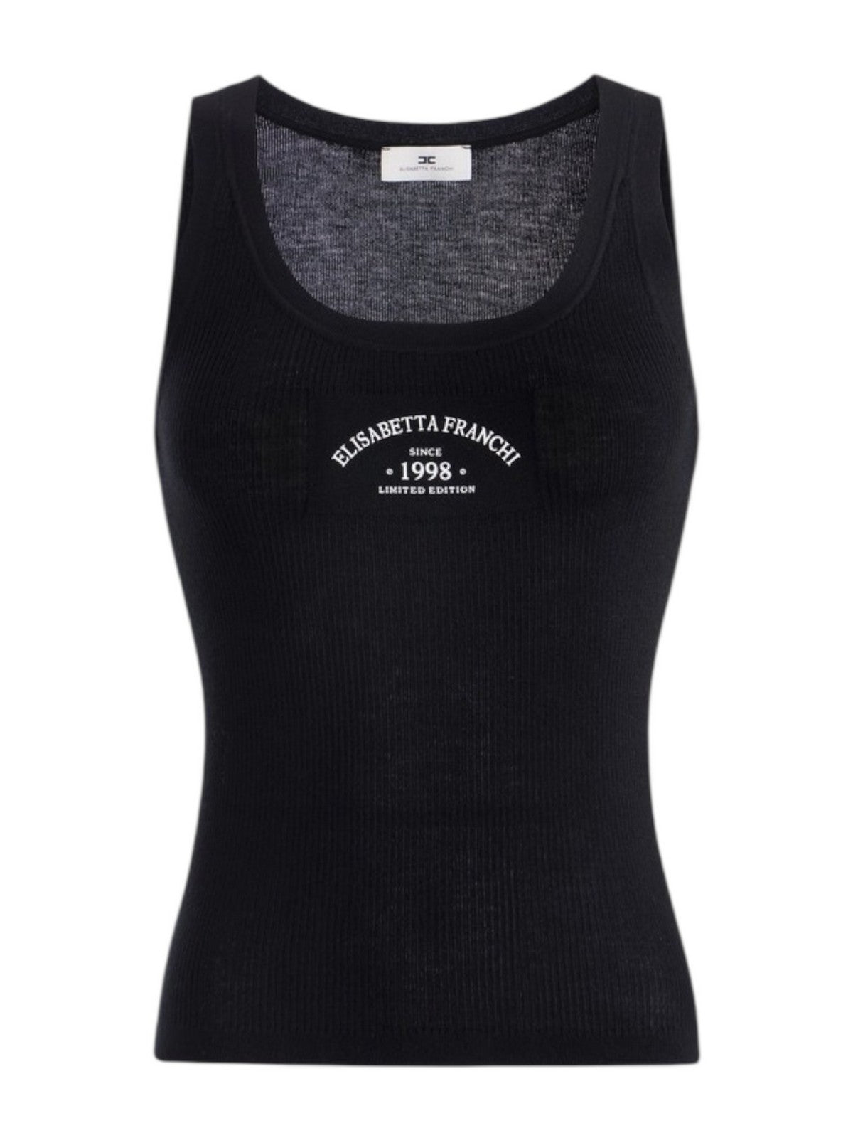Canotta Elisabetta Franchi in maglia con logo, lavorazione a costine e si distingue per l'intarsio in maglia rasata