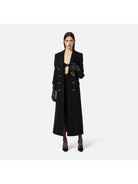 Cappotto ELISABETTA FRANCHI doppiopetto lungo in panno di lana con spalle strutturate, ampio rever a lancia, maniche con spacchetti. Dettagli che elevano lo stile: il taschino con pochette in mussola ricamata con logo e le patte con filetti in raso. Completano i bottoni in metallo dorato di gusto gendarmerie.