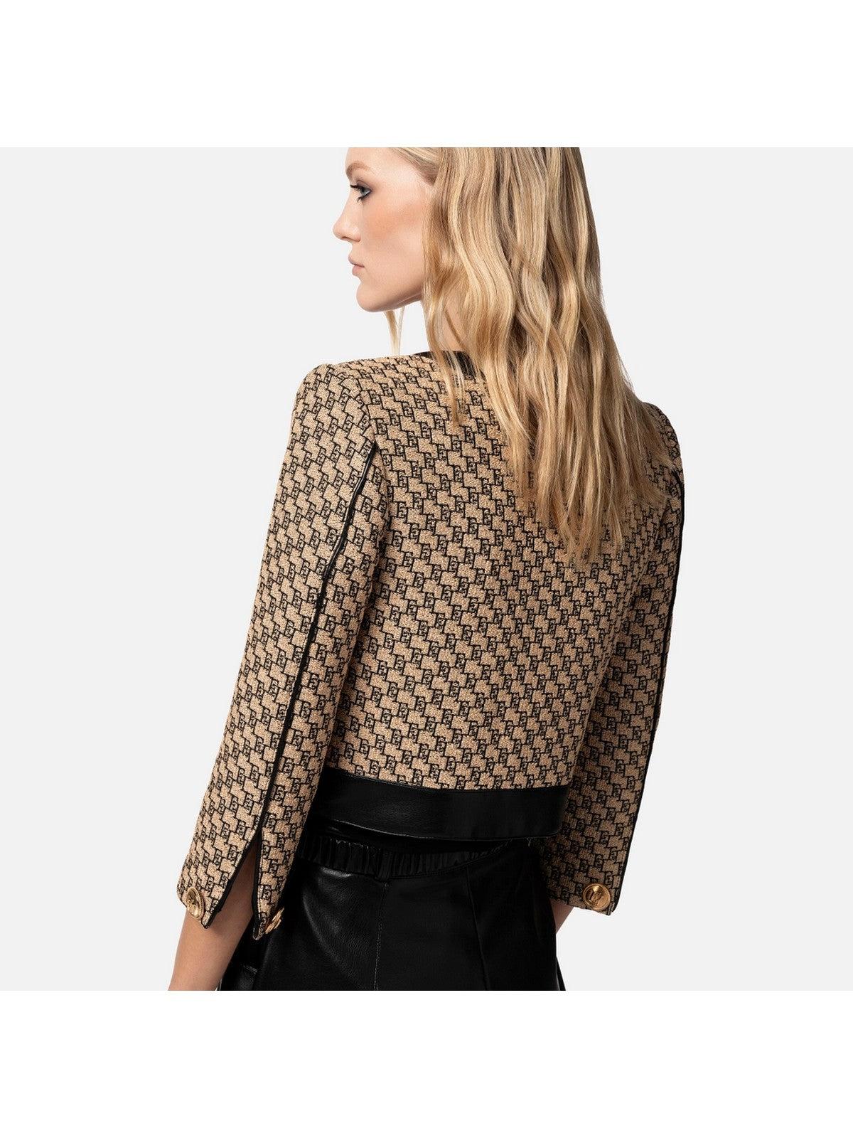 Giacca cropped ELISABETTA FRANCHI in rafia jacquard con profili in materiale sintetico effetto pelle a contrasto. Chiusura con zip. Collo a giro e maniche a 3/4. Tasche frontali a filetto.