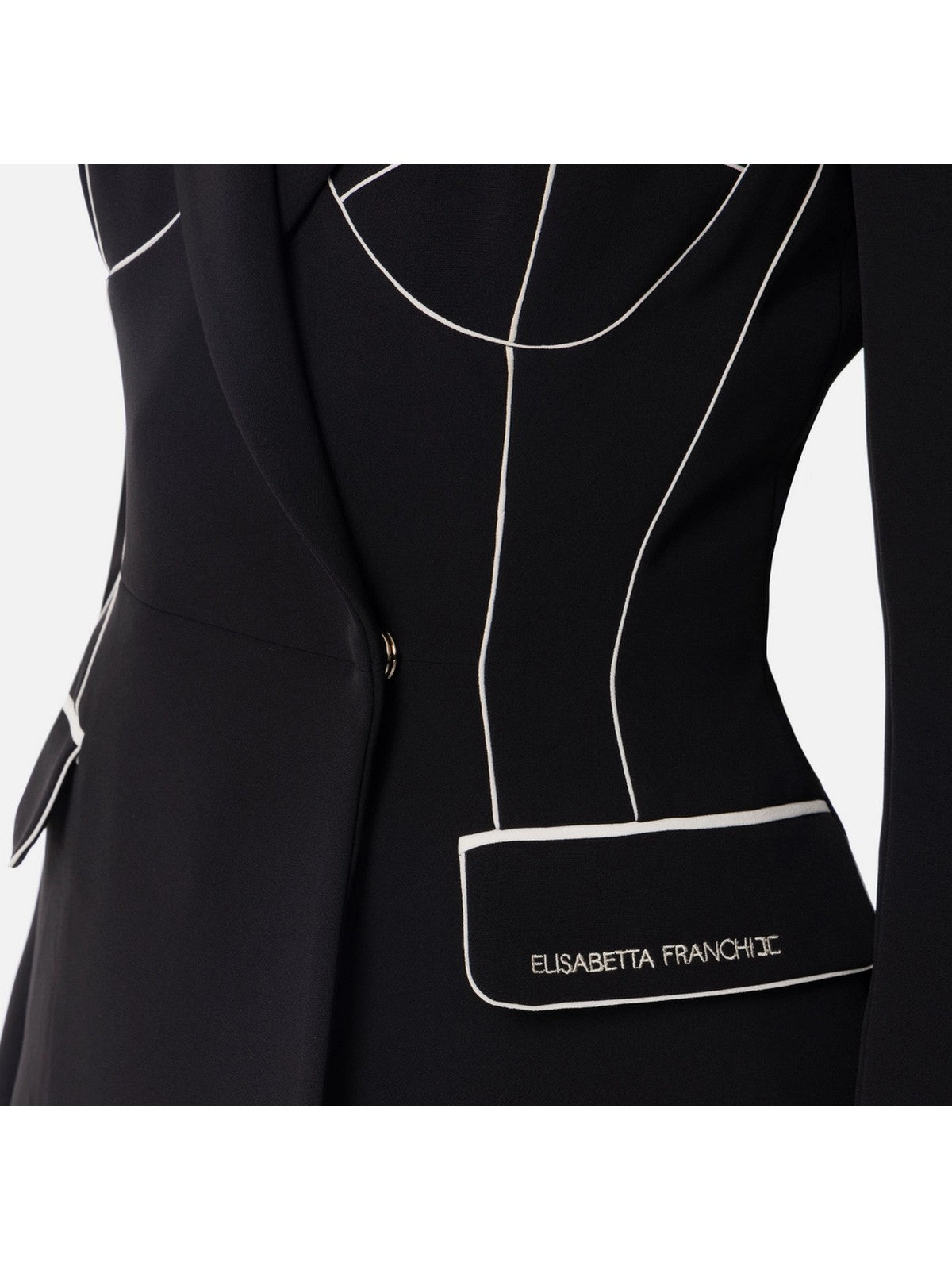 Si distingue per il suo stile grafico: i dettagli di piping a contrasto ricreano un bustier con effetto trompe-l'oeil.