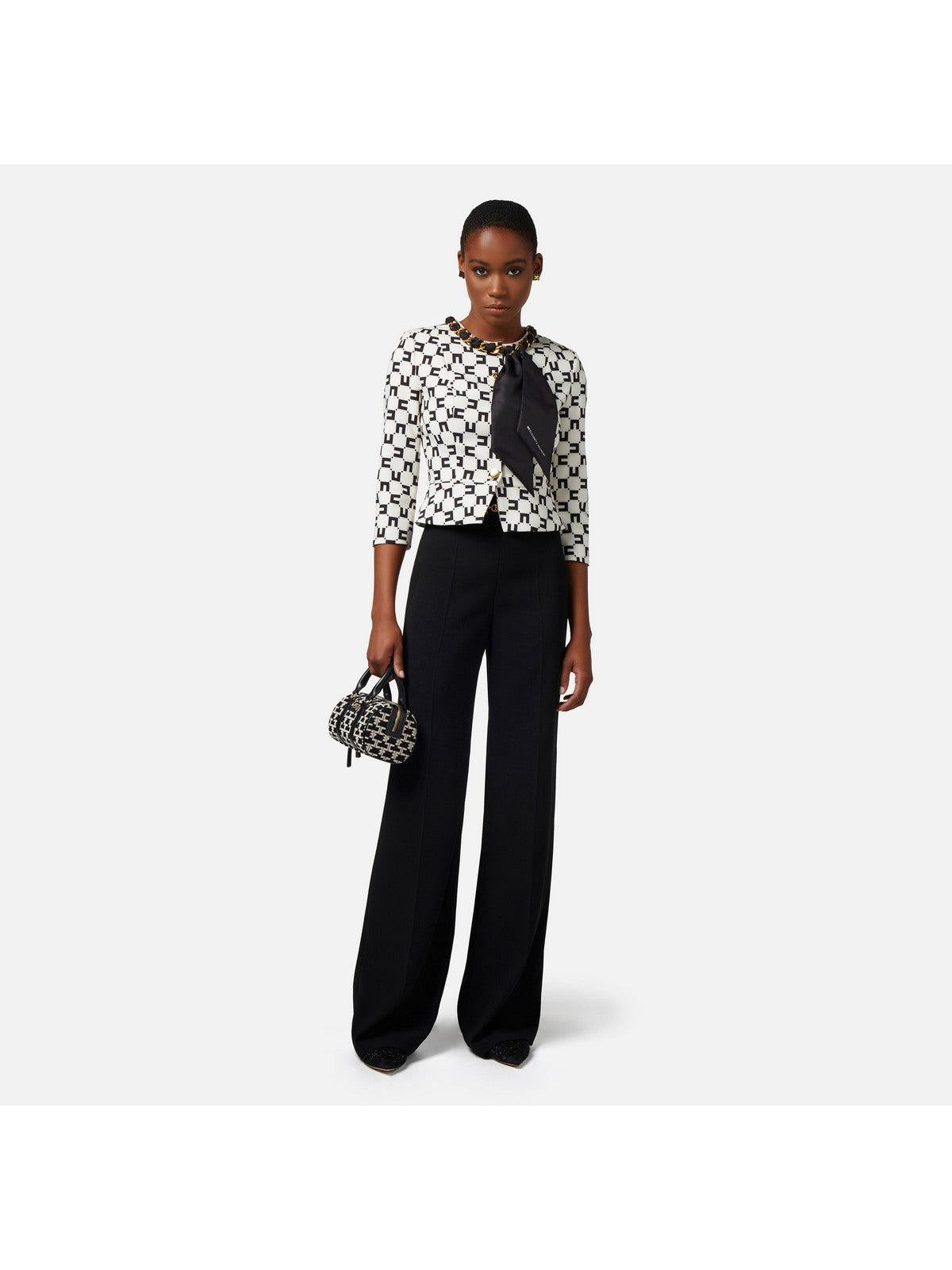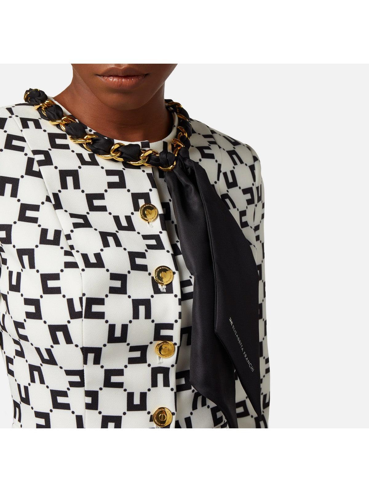 Giacca corta ELISABETTA FRANCHI in doppio crêpe stretch stampa logo doppia C all-over. Chiusura a monopetto con bottoni in metallo dorati. Scollo a giro impreziosito da accessorio in catena e foulard infilato e maniche a 3/4.