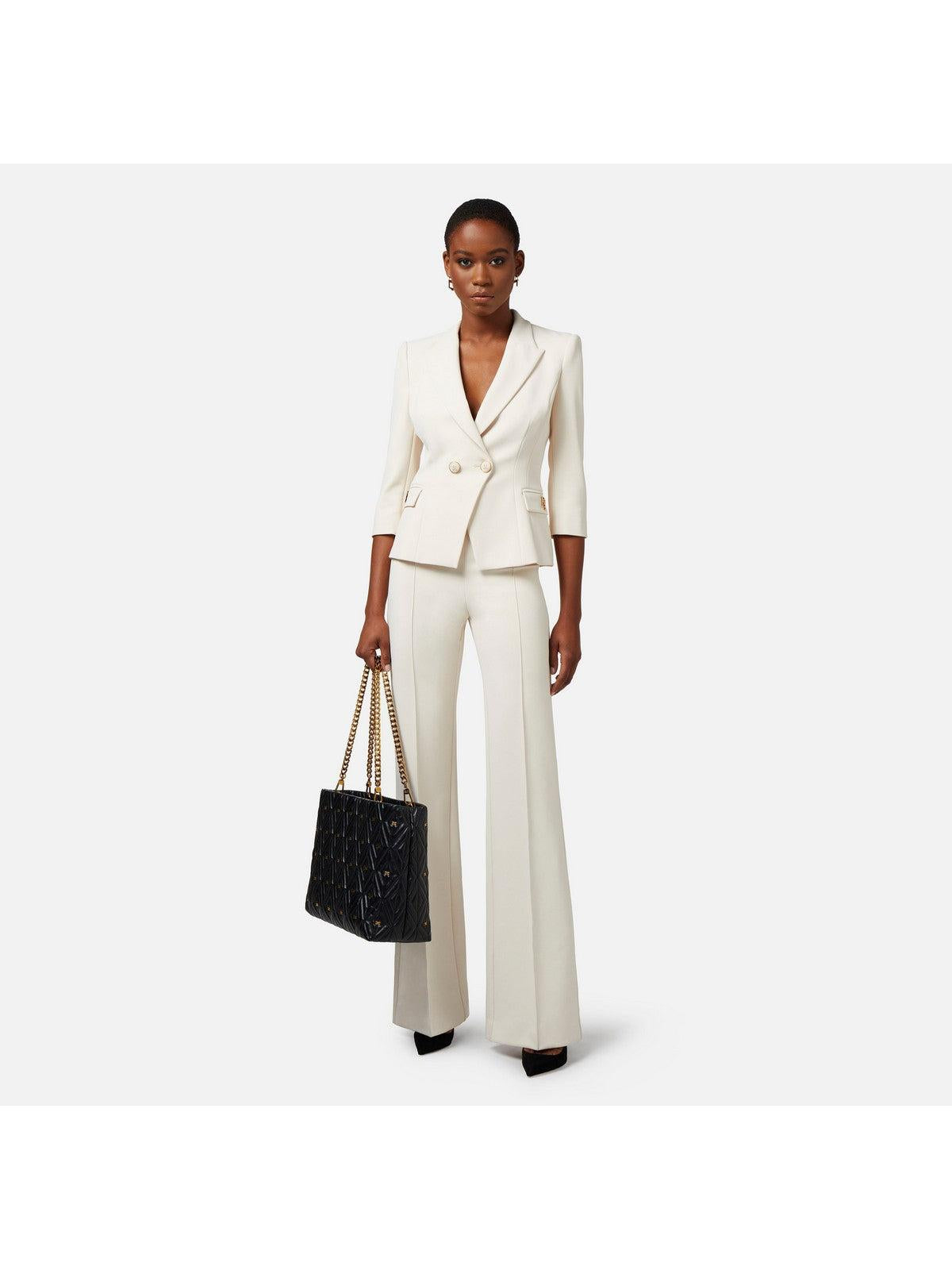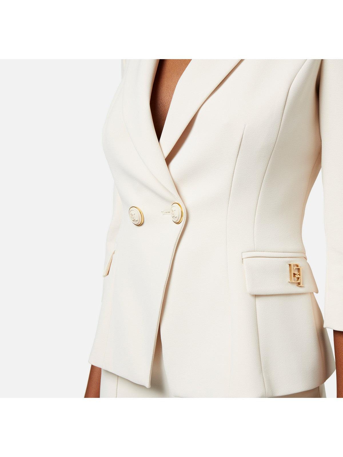 Giacca ELISABETTA FRANCHI in doppio crêpe. Chiusura doppiopetto con bottoni in tinta. Tasche frontali con pattina e placca logo in metallo dorato. Revers a lancia e maniche a 3/4.