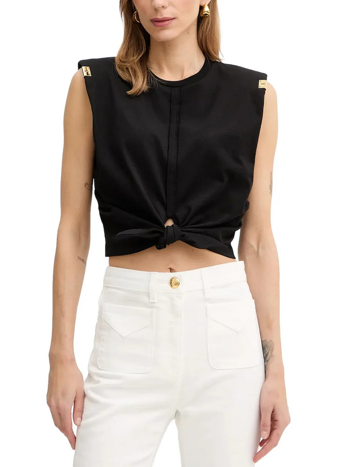 T-shirt Elisabetta Franchi in jersey con nodo, rifinita con inserti di passamaneria a taglio vivo e impunture.