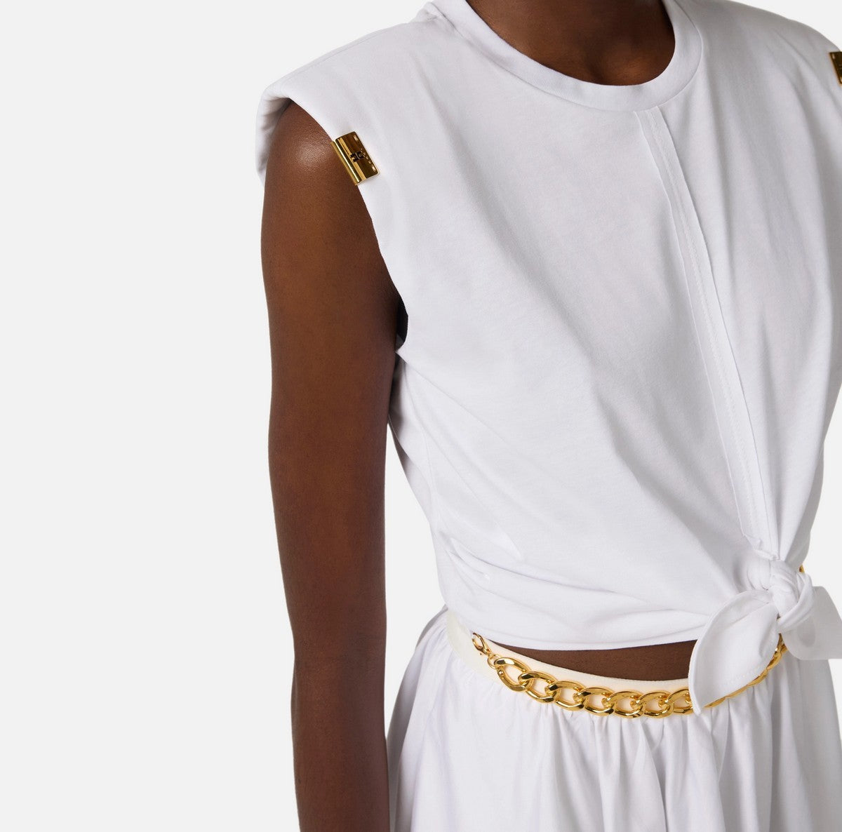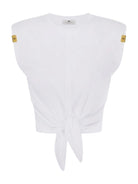 T-shirt Elisabetta Franchi in jersey con nodo, rifinita con inserti di passamaneria a taglio vivo e impunture.