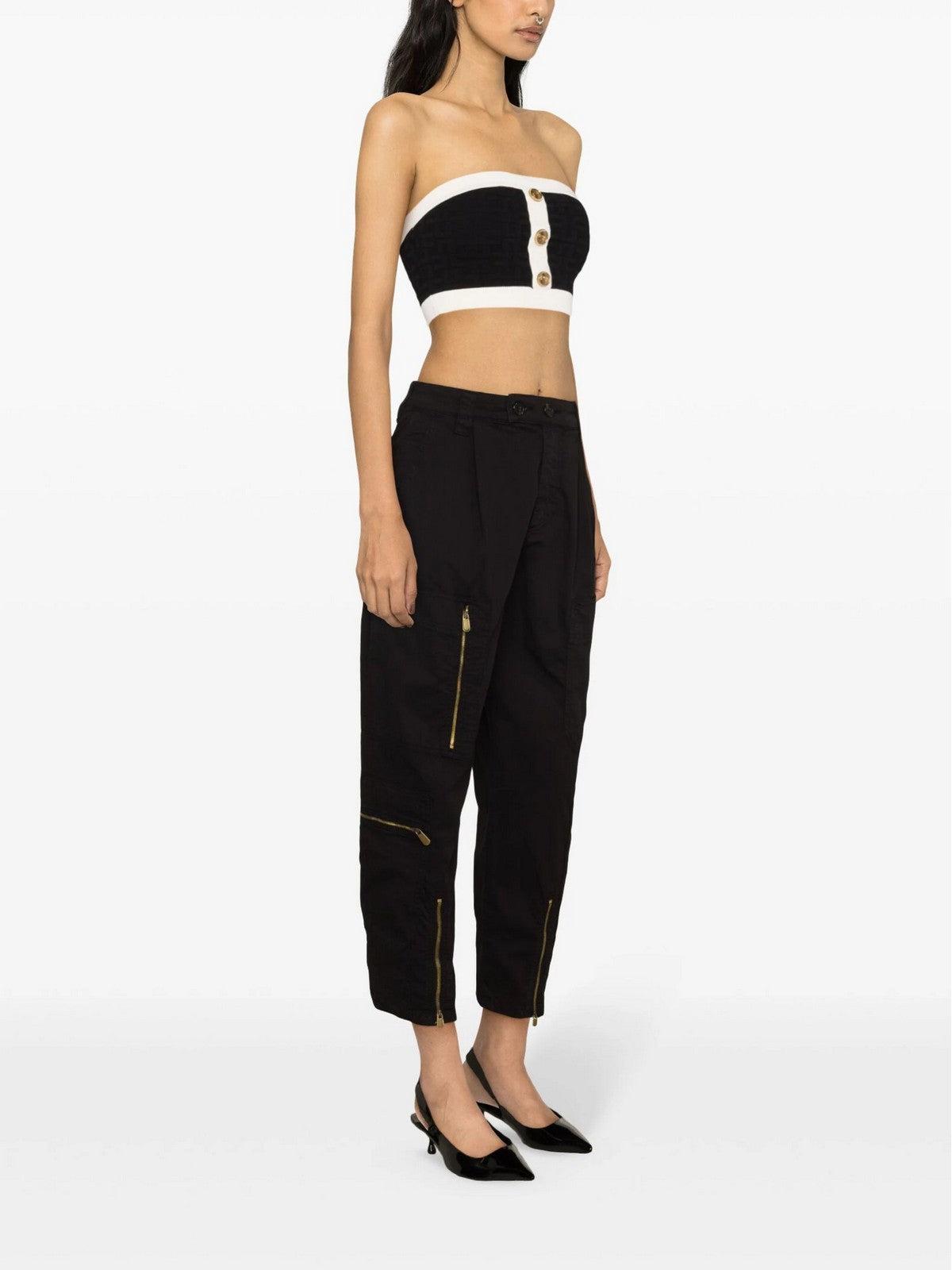 Top ELISABETTA FRANCHI in viscosa embossed con logo doppia C all-over e finiture in contrasto di colore. Modello a fascia. Scollo a madonna impreziosito da bottoni in metallo dorato. Vestibilità aderente.