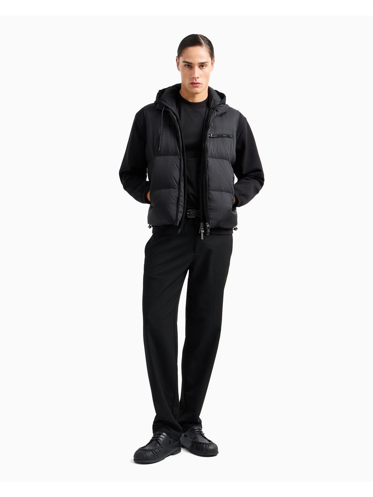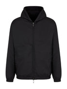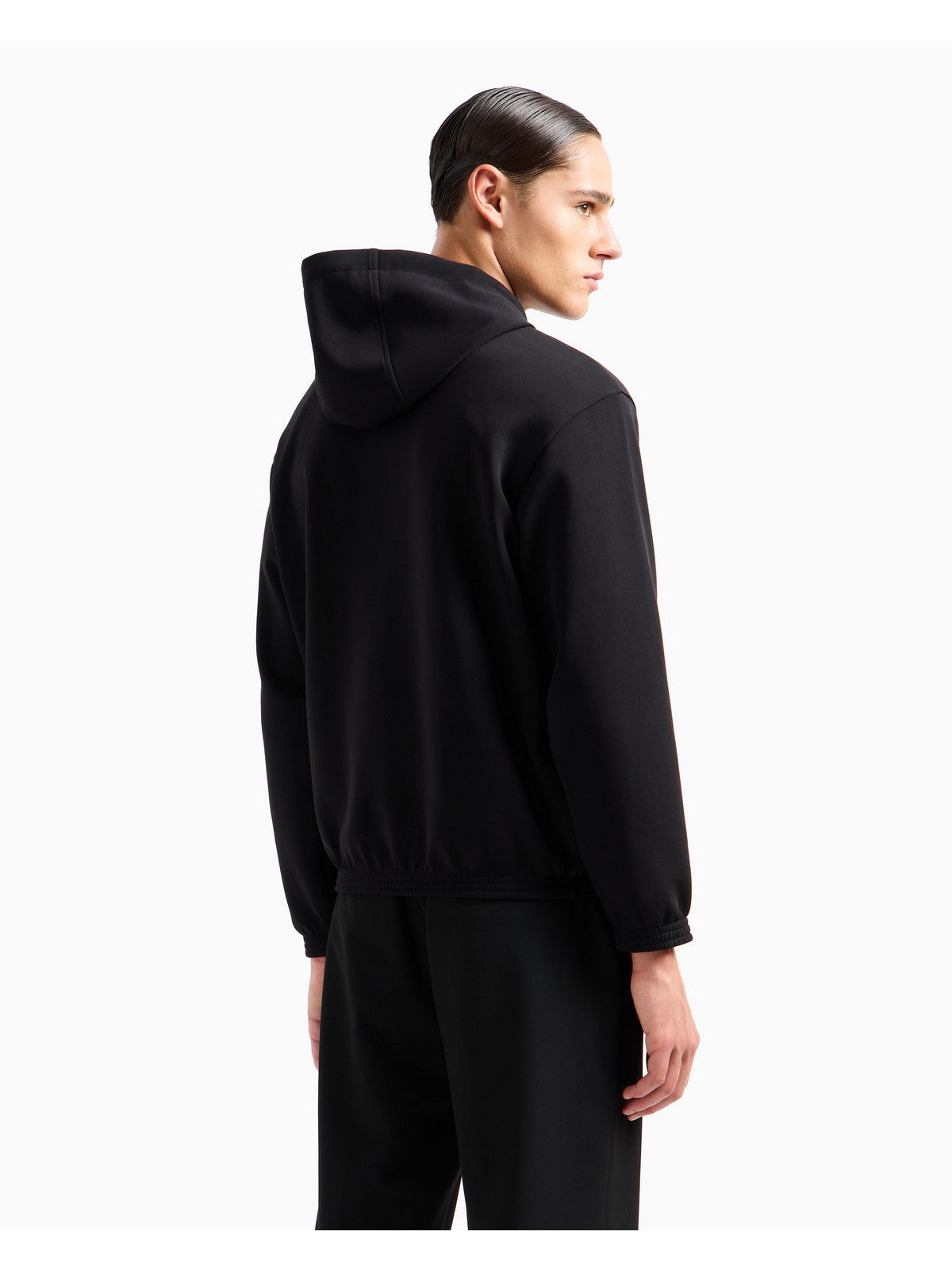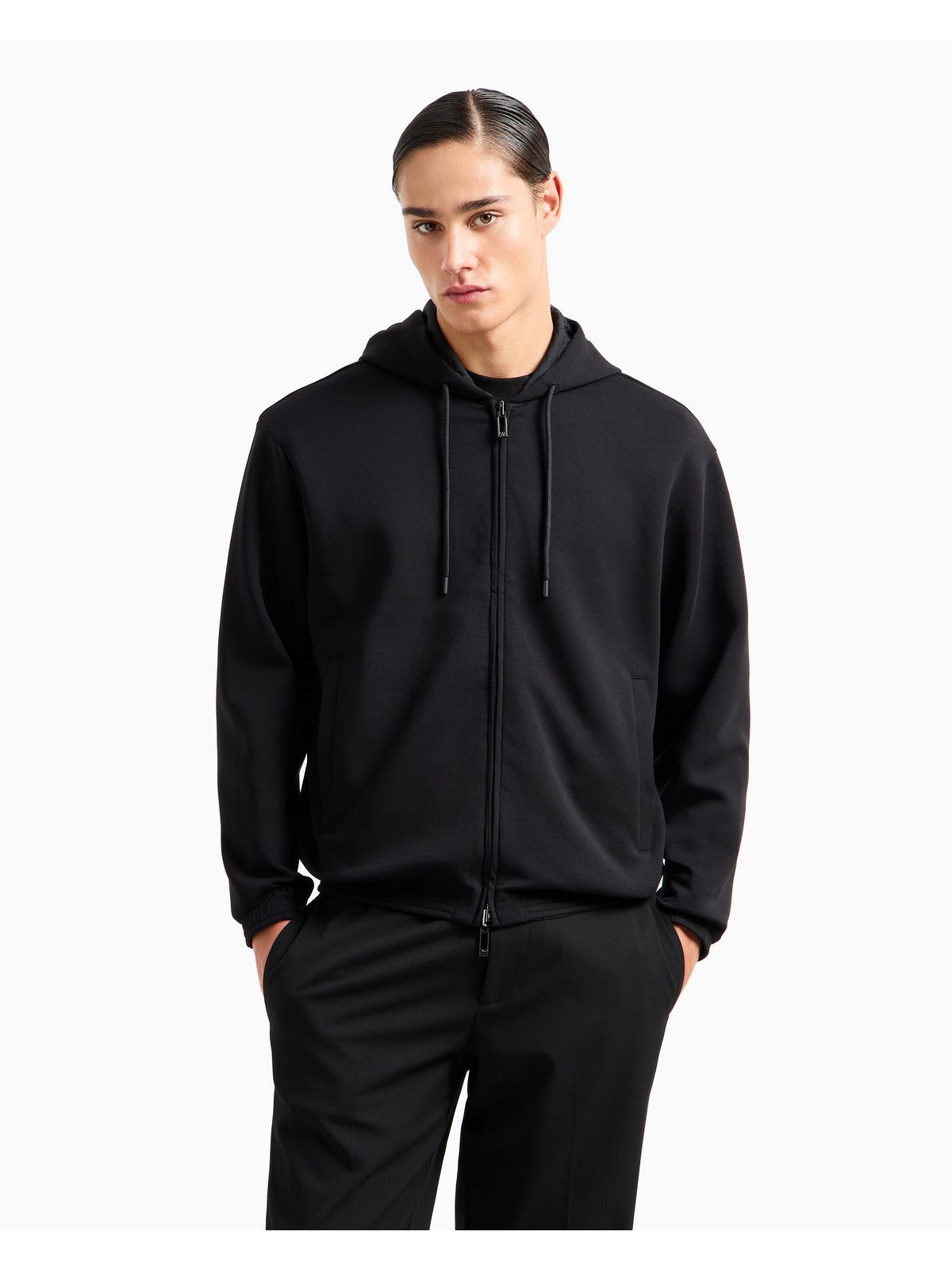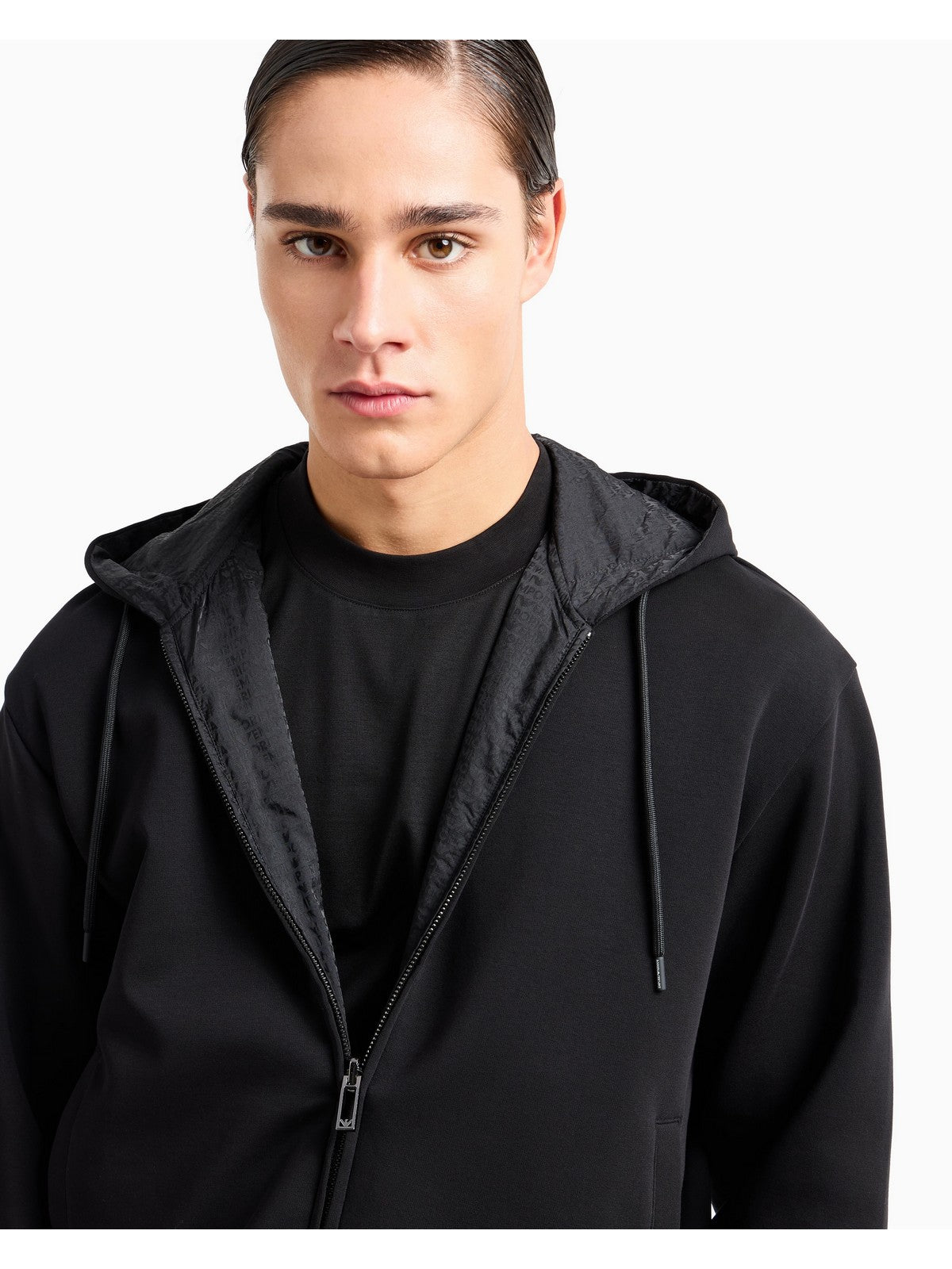 Felpa EMPORIO ARMANI reversibile, il lato esterno mostra morbida texture in double jersey a tinta unita, mentre il lato interno in nylon è impreziosito da fitto logo lettering a lavorazione jacquard