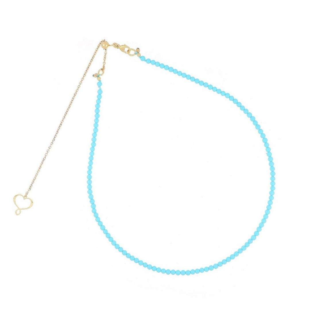 Girocollo chocker in pietre di pasta di turchese di 2,5 mm realizzato con catena in argento 925 placcato in oro giallo ad alto spessore e ad alta resistenza. La misura della collana è regolabile fino ad un massimo di 42 cm grazie alla piccola sfera scorrevole. Chiusura a moschettone.
