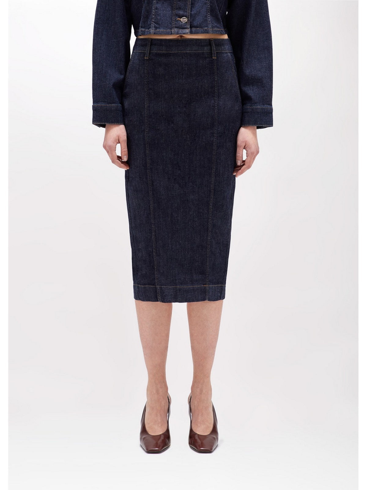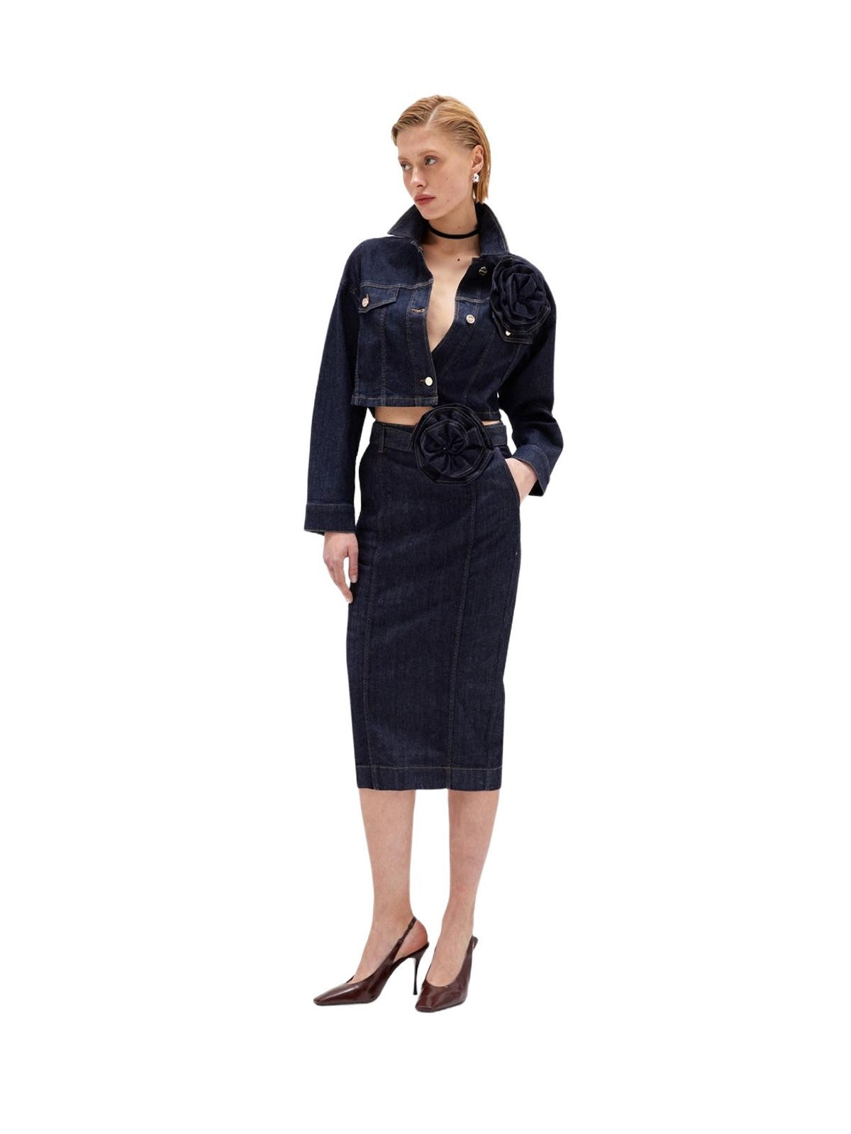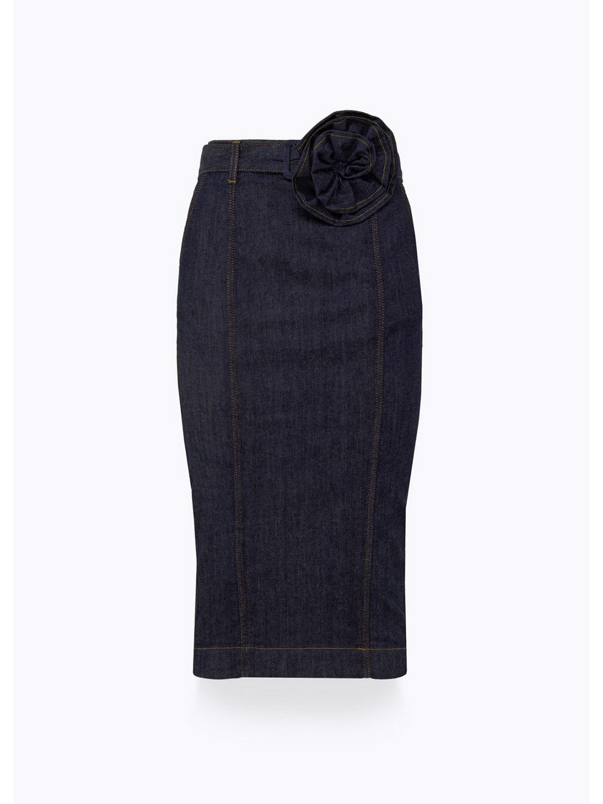 RILETTURA SARTORIALE DEL DENIM CON QUESTA GONNA PENCIL IN JEANS STRETCH ABBINATA A UNA CINTURA CON MAXI ROSA A SPILLA. HA LAVAGGIO RINSE SCURO, ZIP IN METALLO SUL RETRO, TASCHE APPLICATE, LUNGHEZZA MIDI. UN BASIC-NO-BASIC DA ABBINARE A TUTTO IL GUARDAROBA. COMPOSIZIONE: 98% COTONE 2% ELASTAN