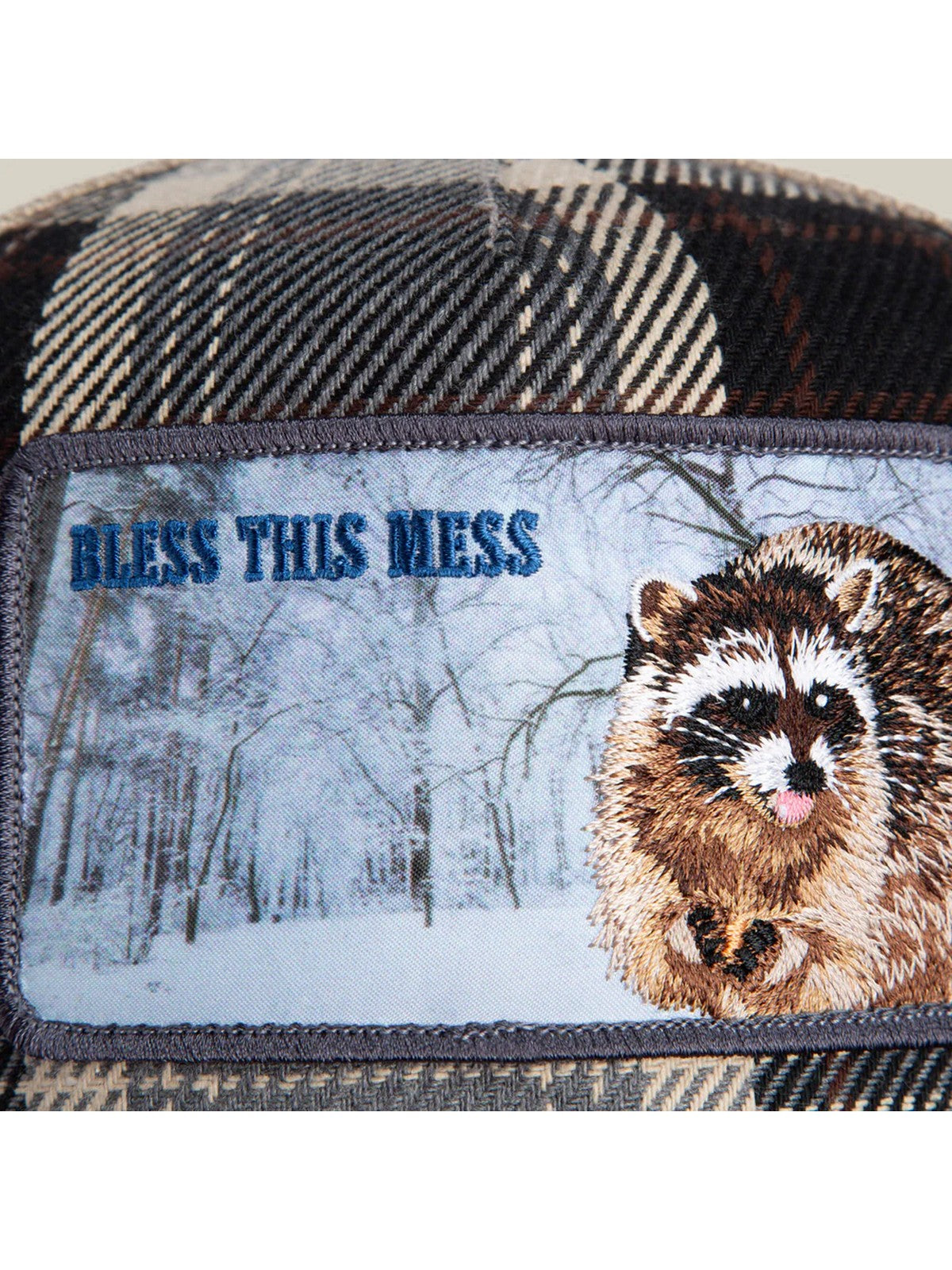Cappello GOORIN BROSS Corona scozzese, falda in denim e una toppa con un procione che sfoggia il caos come un distintivo.
