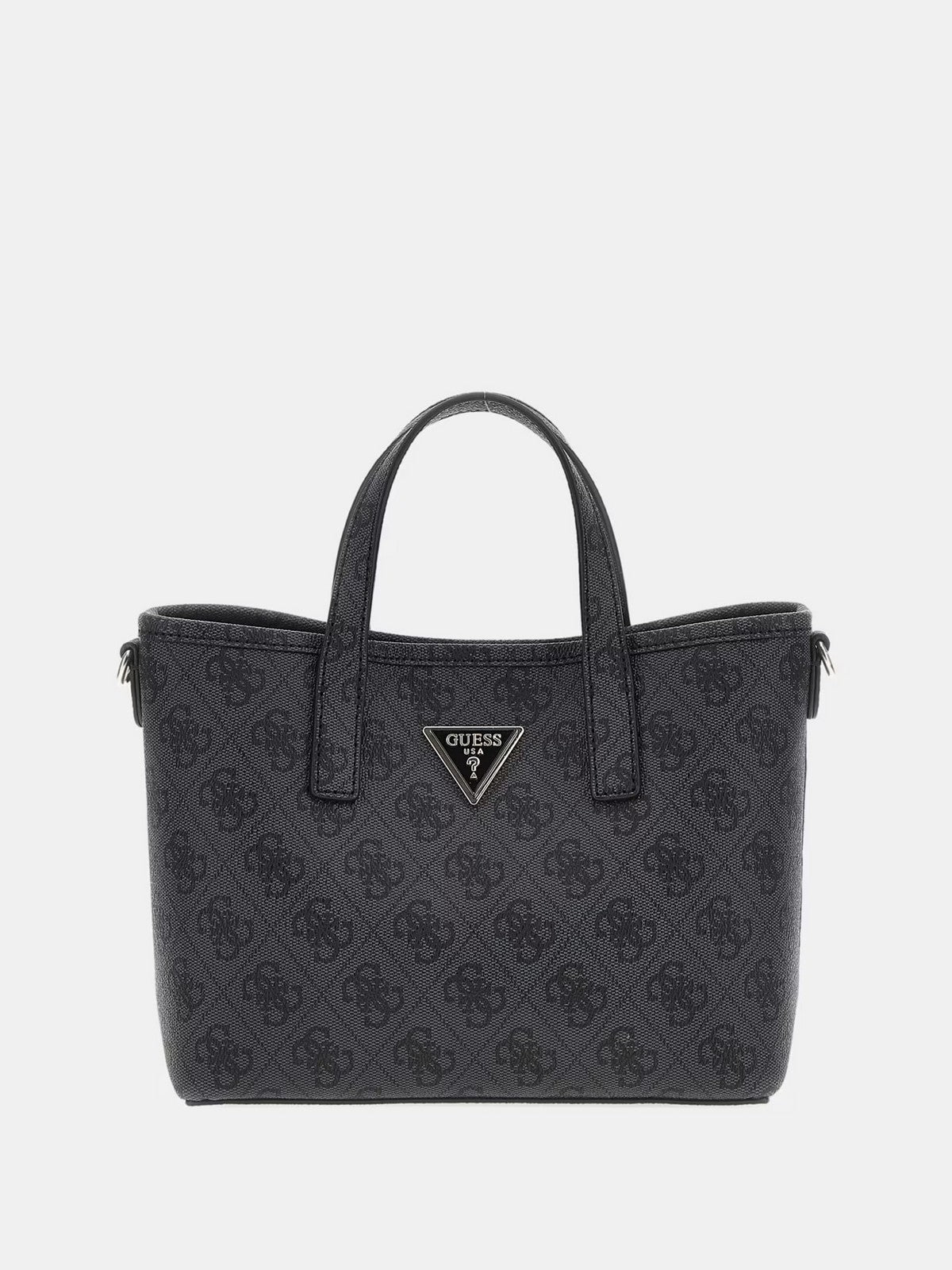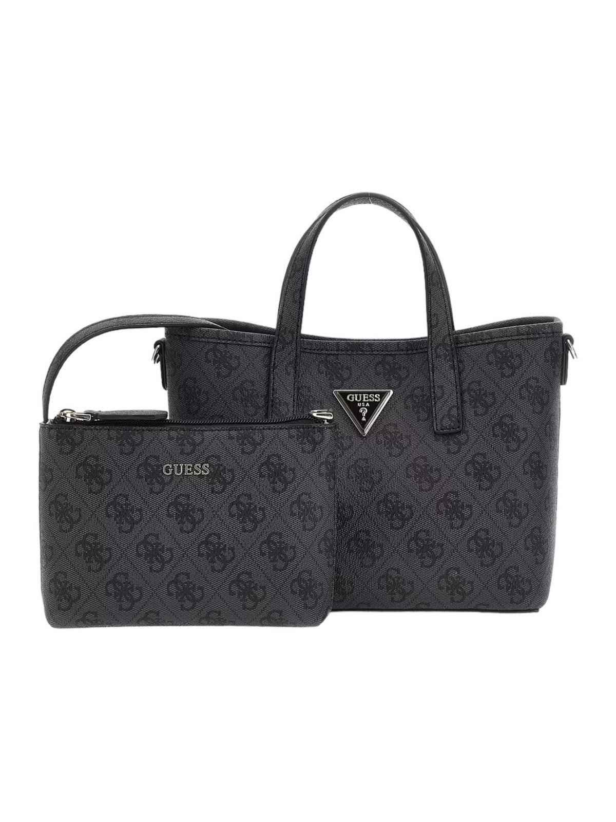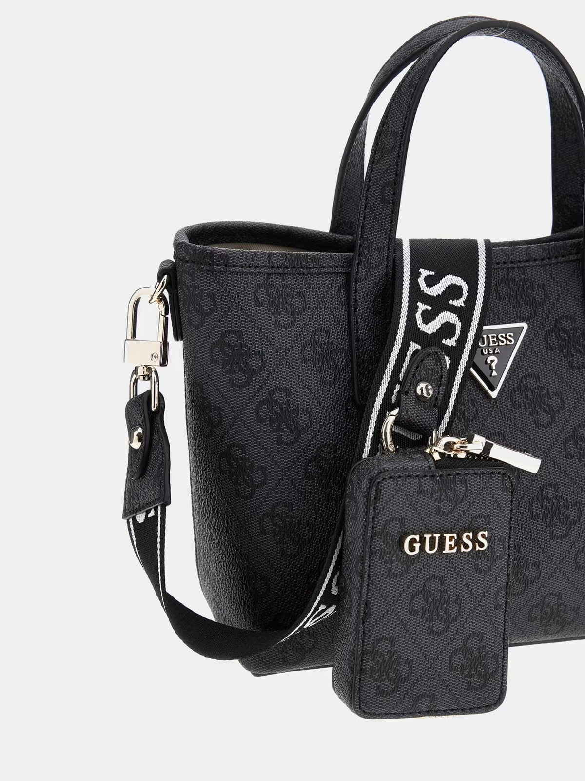 Borsa GUESS in simil pelle. Stampa 4G logo. Triangolo logo in metallo frontale. Pochette interna con cerniera lampo. Tracolla in tessuto logata, removibile. Charm pochette removibile su tracolla. Chiusura con bottone automatico.