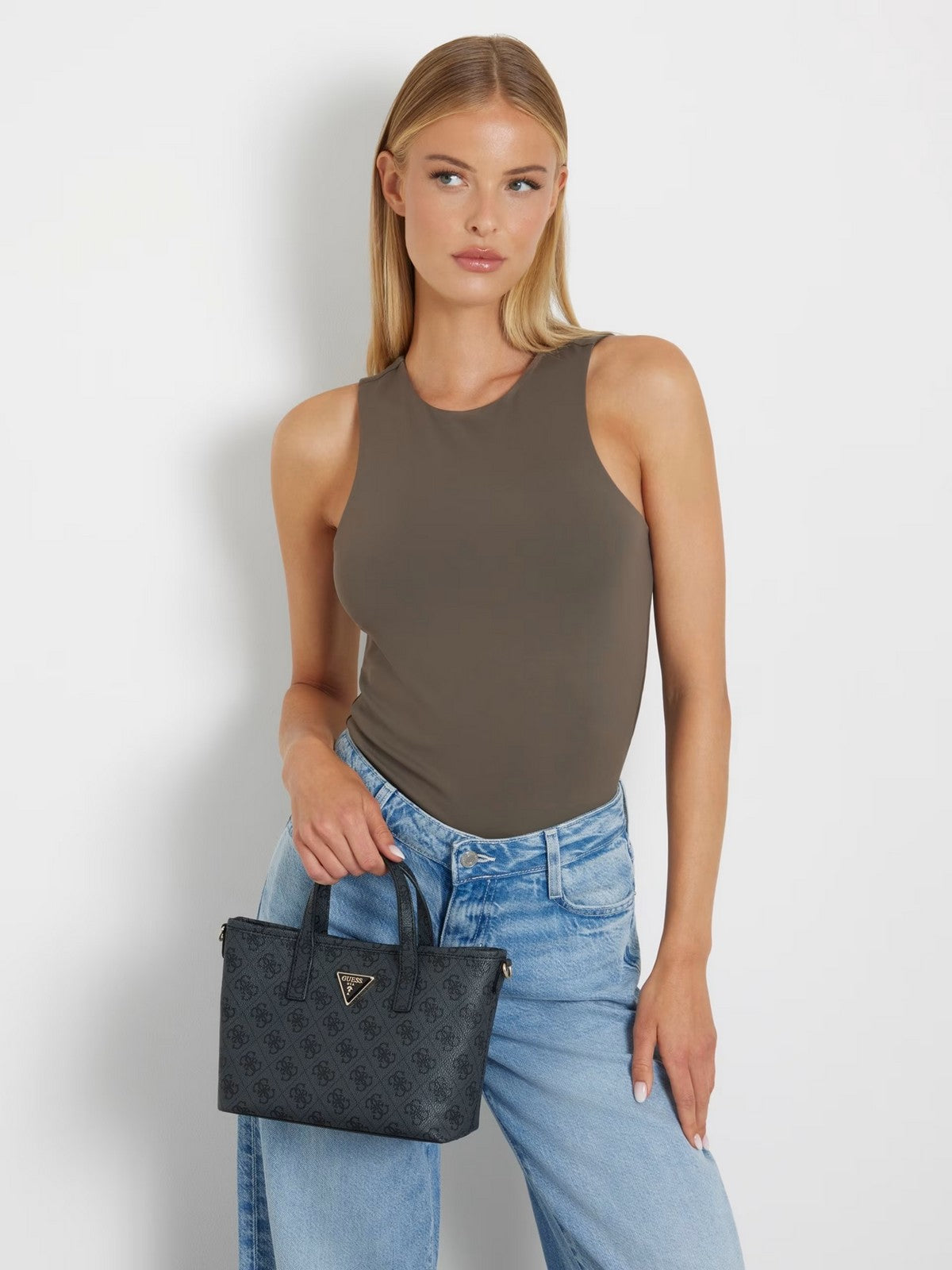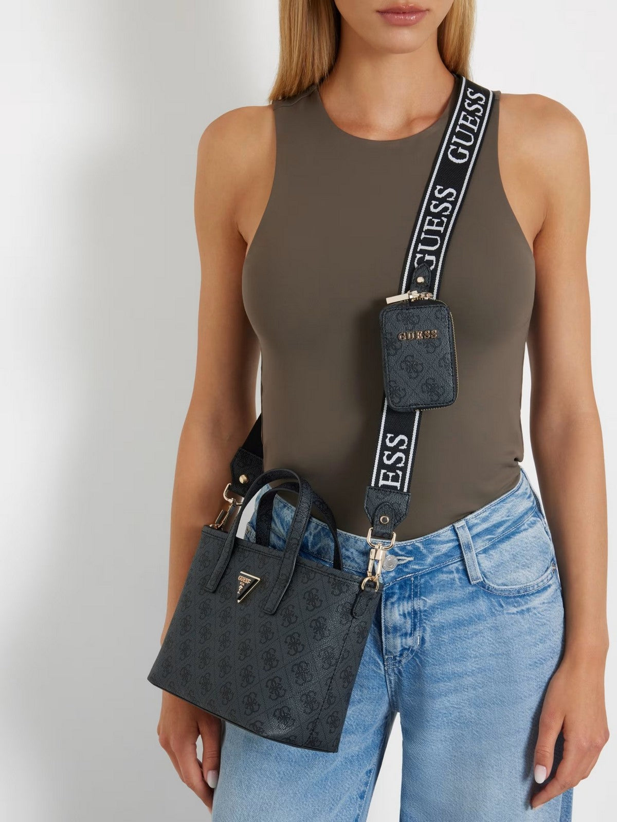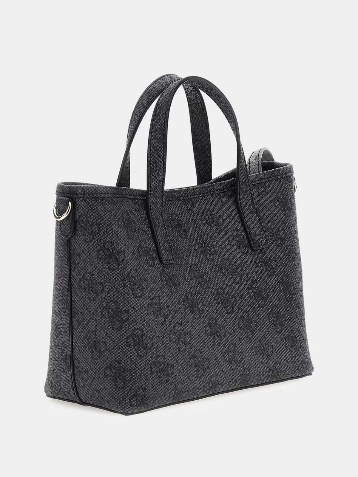 Borsa GUESS in simil pelle. Stampa 4G logo. Triangolo logo in metallo frontale. Pochette interna con cerniera lampo. Tracolla in tessuto logata, removibile. Charm pochette removibile su tracolla. Chiusura con bottone automatico.