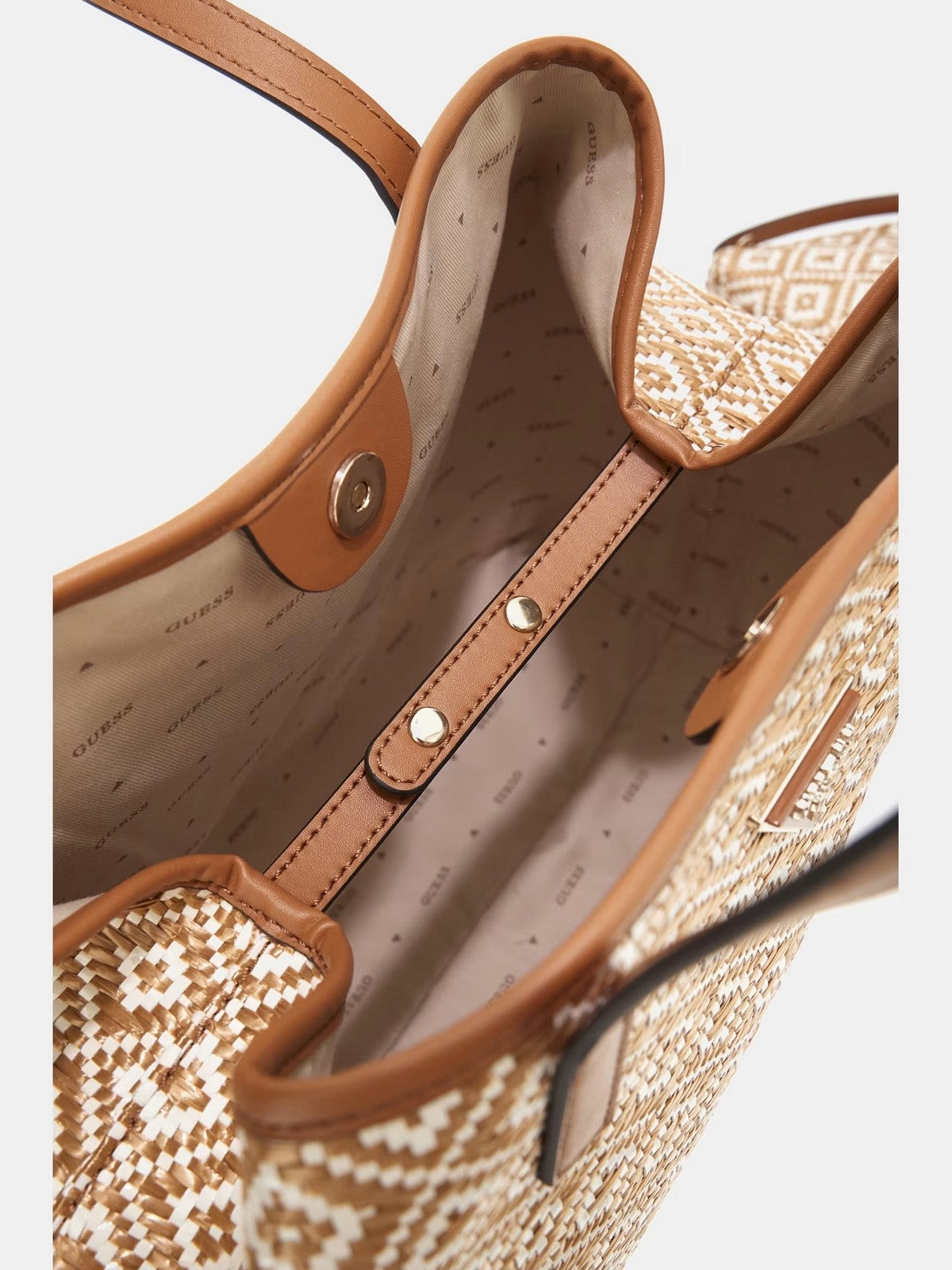 Borsa GUESS realizzata in rafia con Inserti in simil pelle. Lavorazione geometrica. Triangolo logo in metallo frontale. Chiusura con bottone.