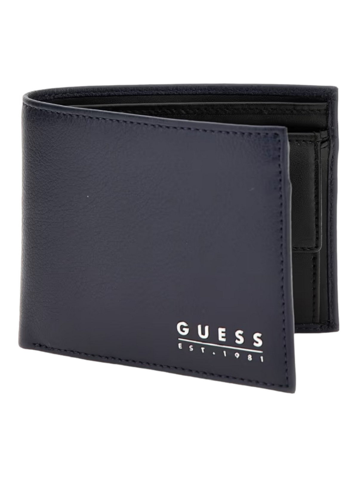 Portafoglio uomo GUESS in pelle. Scritta logo a contrasto. All'interno scomparto per carte business, documenti e banconote. Scomparto per monete con chiusura.