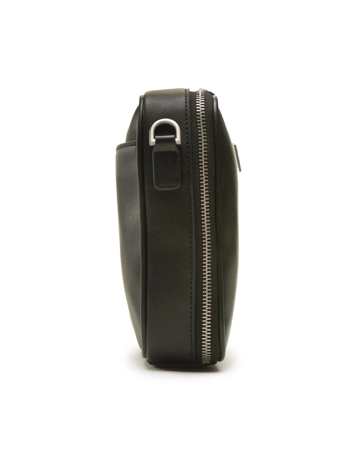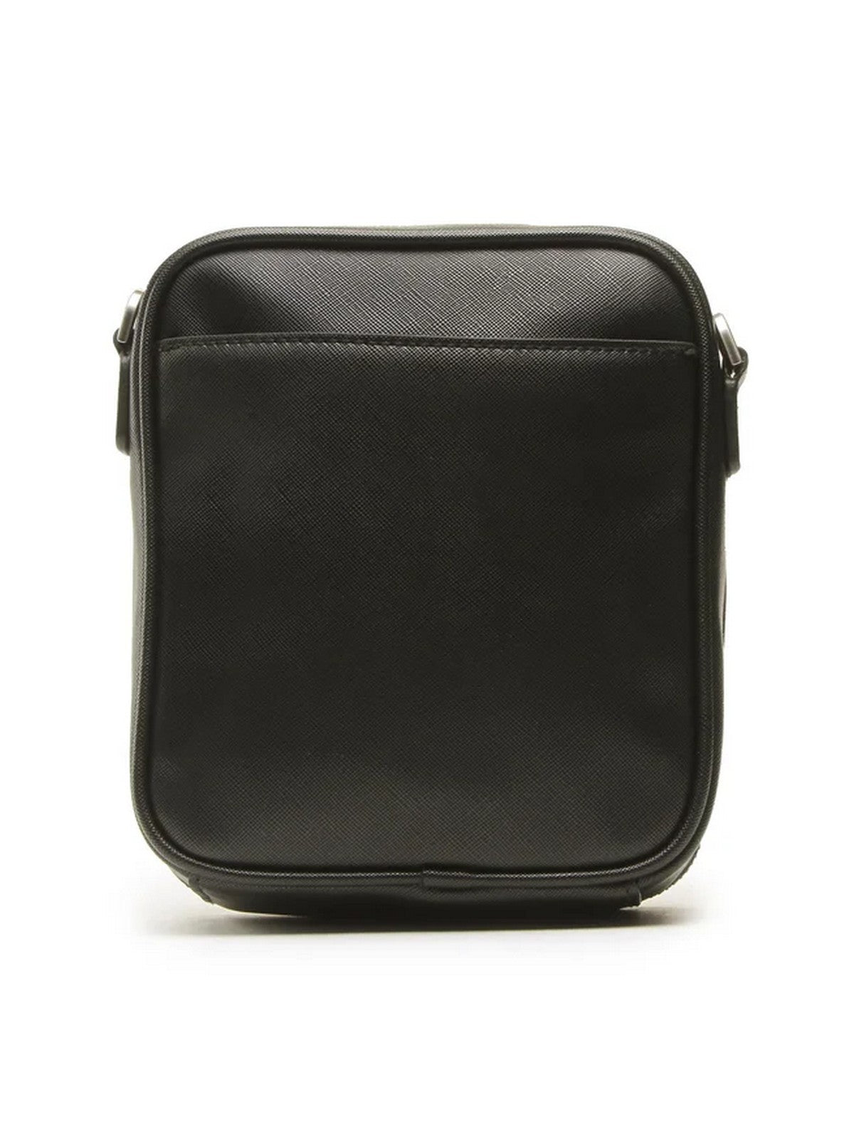 Tracolla GUESS in simil pelle idrorepellente, lavorazione saffiano. Triangolo logo in metallo frontale. Tasca esterna sul retro.
