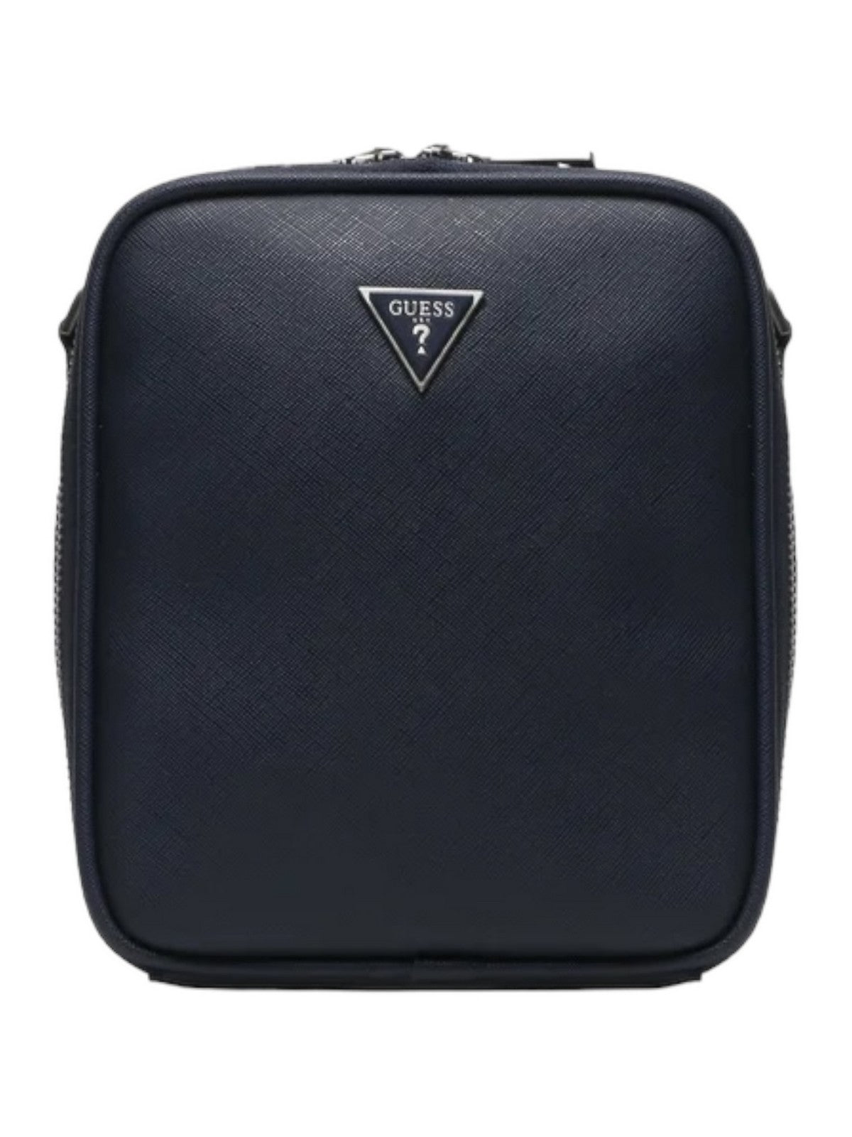 Tracolla GUESS in simil pelle idrorepellente, lavorazione saffiano. Triangolo logo in metallo frontale. Tasca esterna sul retro.