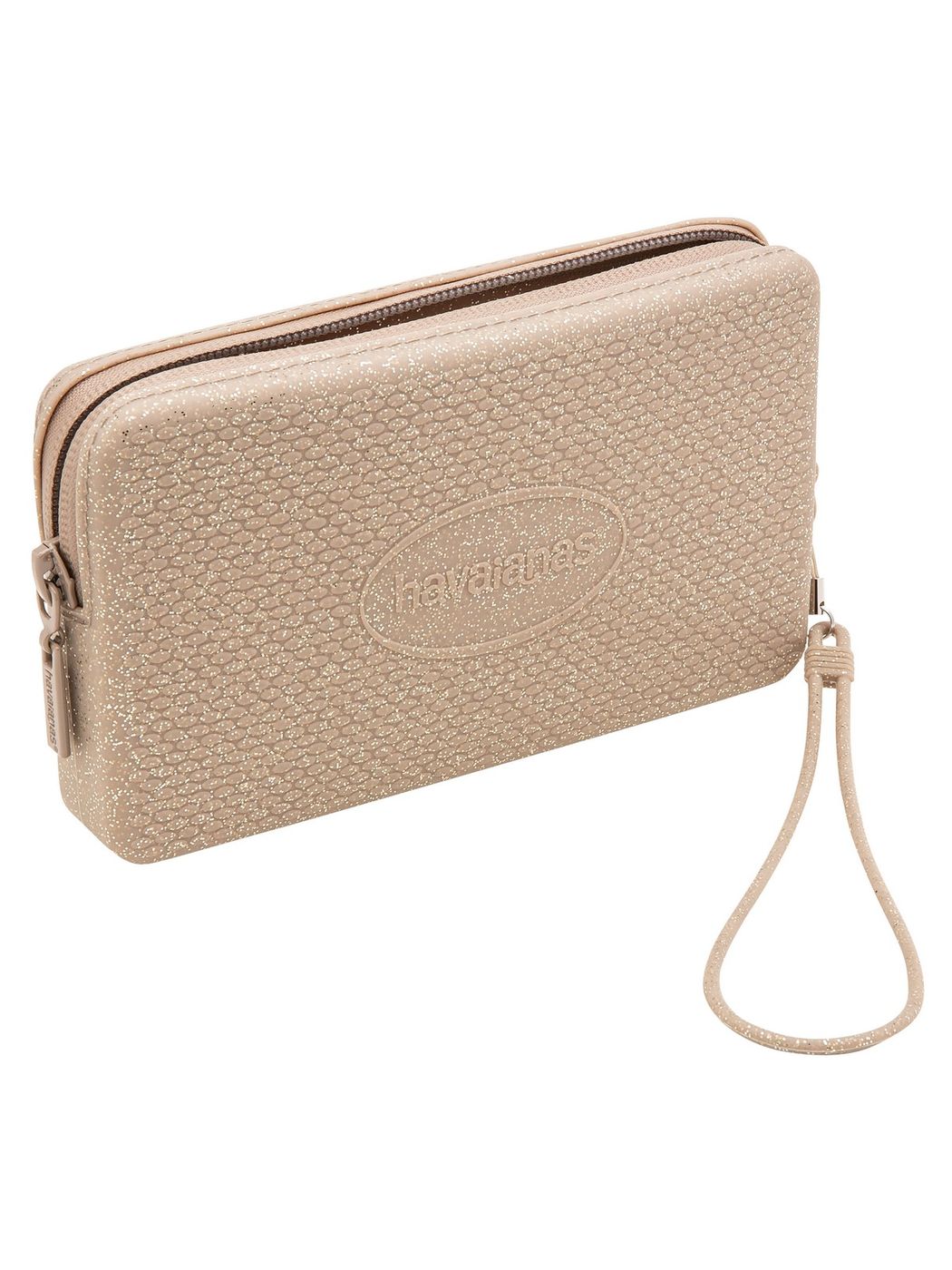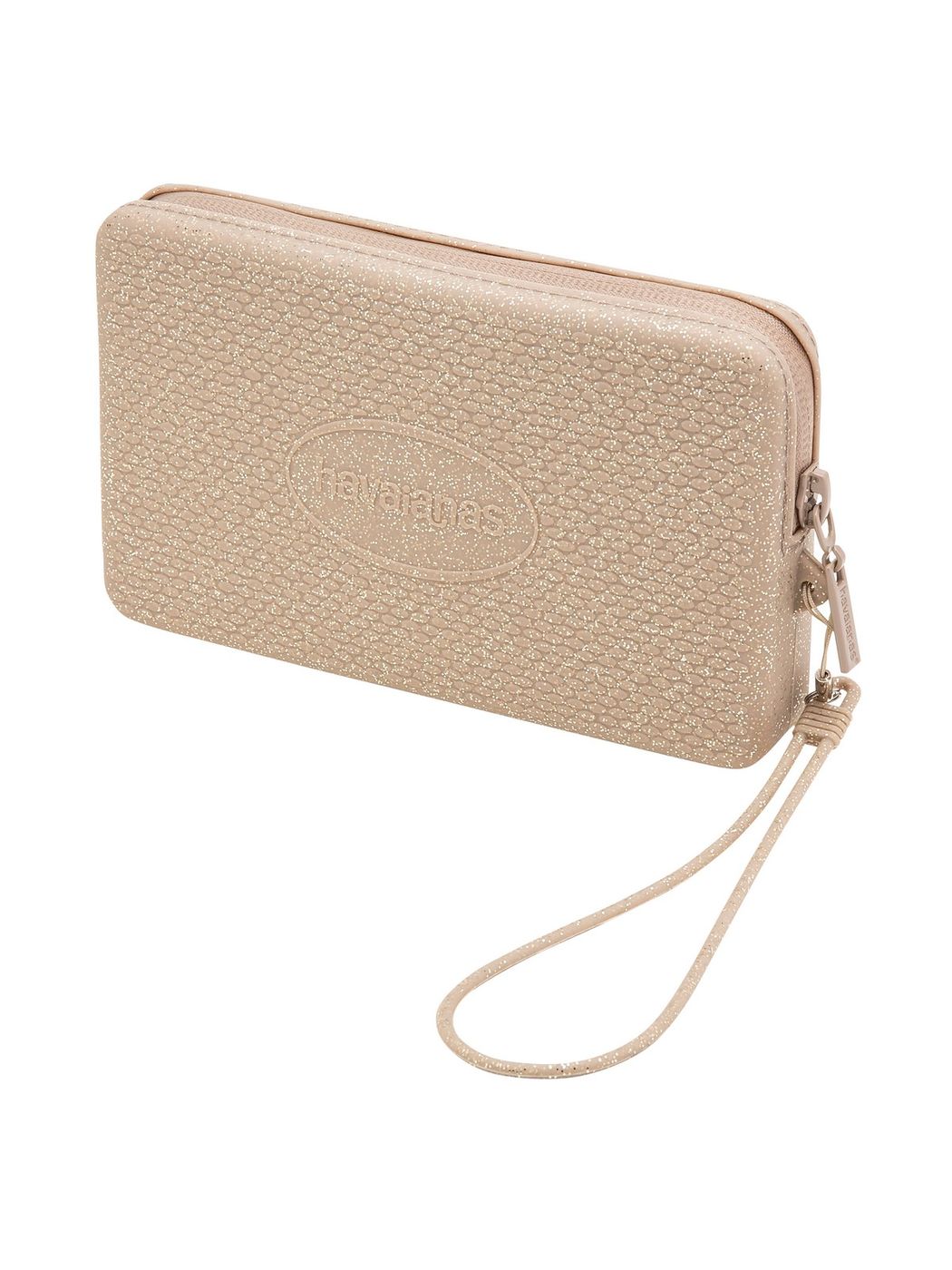 Mini pochette HAVAIANAS in silicone tinta unita glitterato con logo in metallo sul fronte. Chiusura con zip. Cinturino da polso.