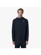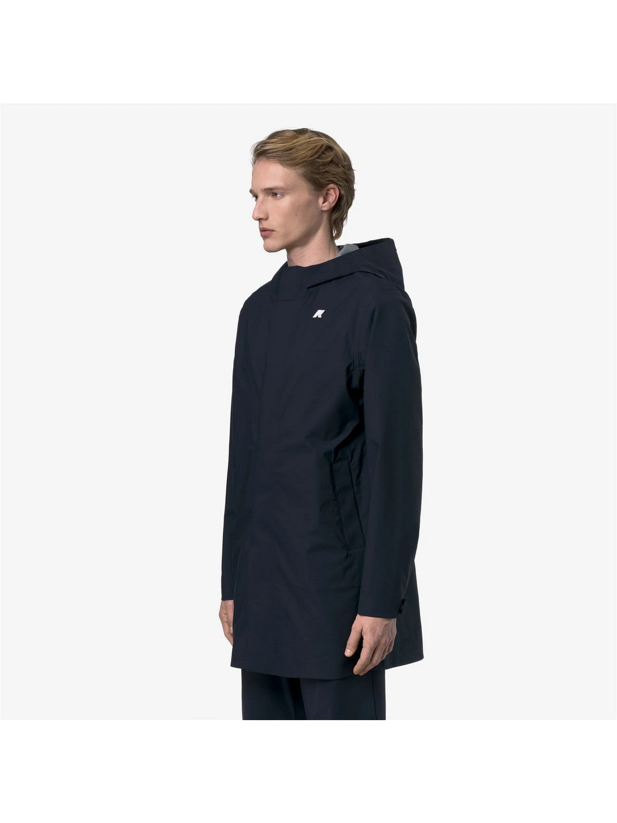 Giubbino K-WAY Tommy a tre quarti realizzato in tessuto tecnico stretch, impermeabile e antivento all'esterno con membrana isolante e cuciture termonastrate.