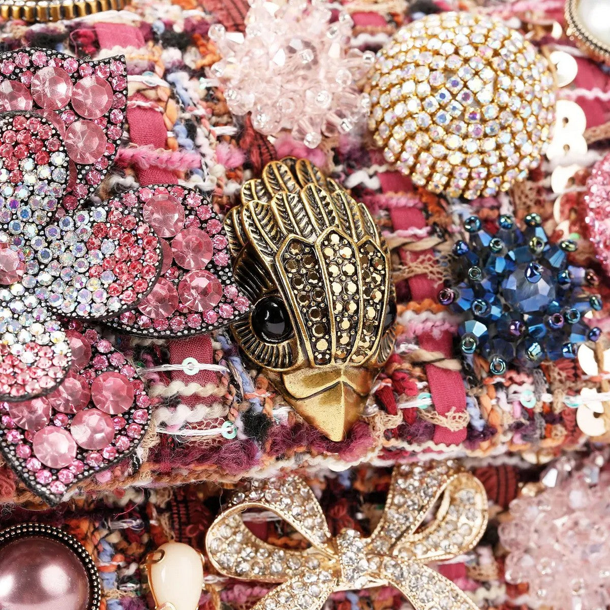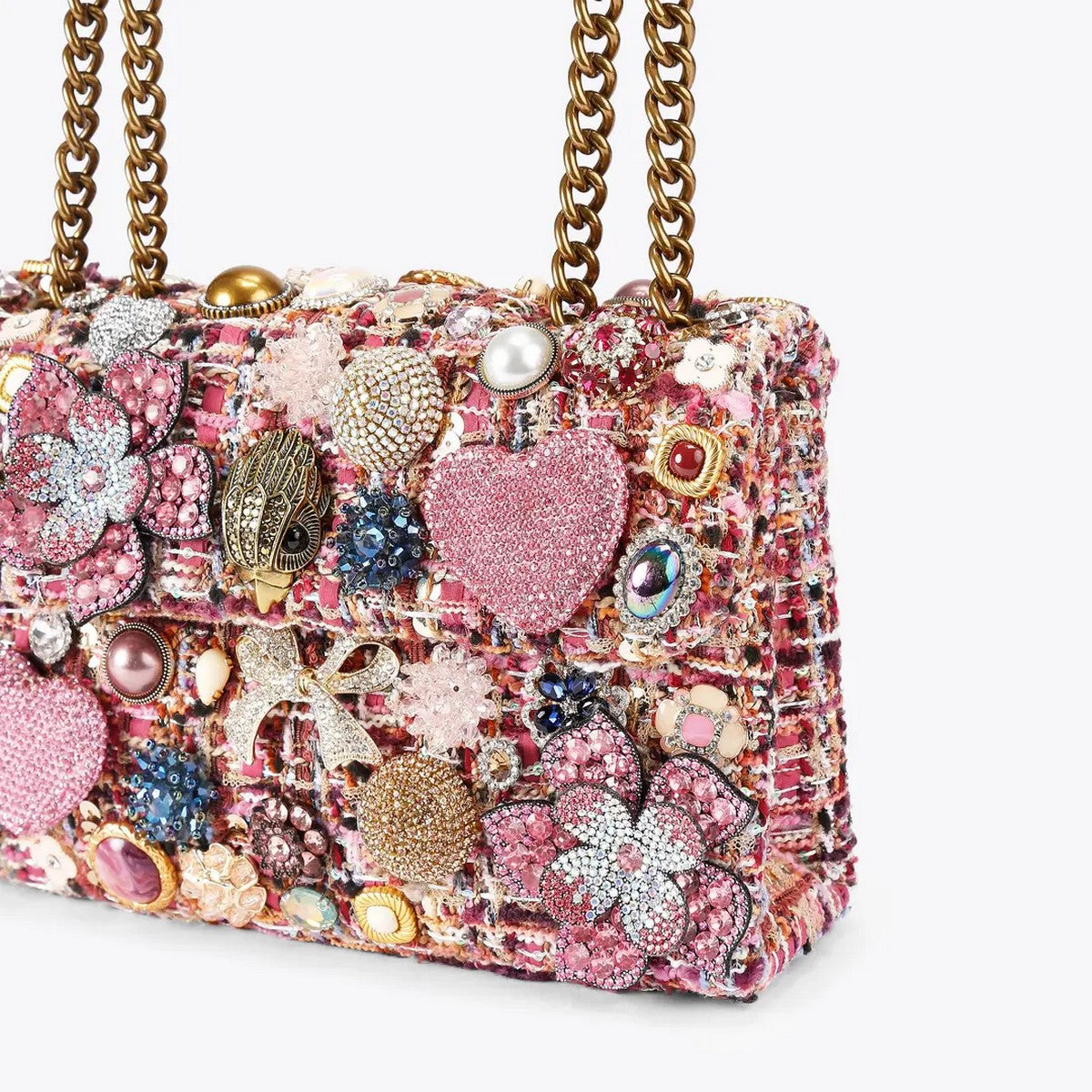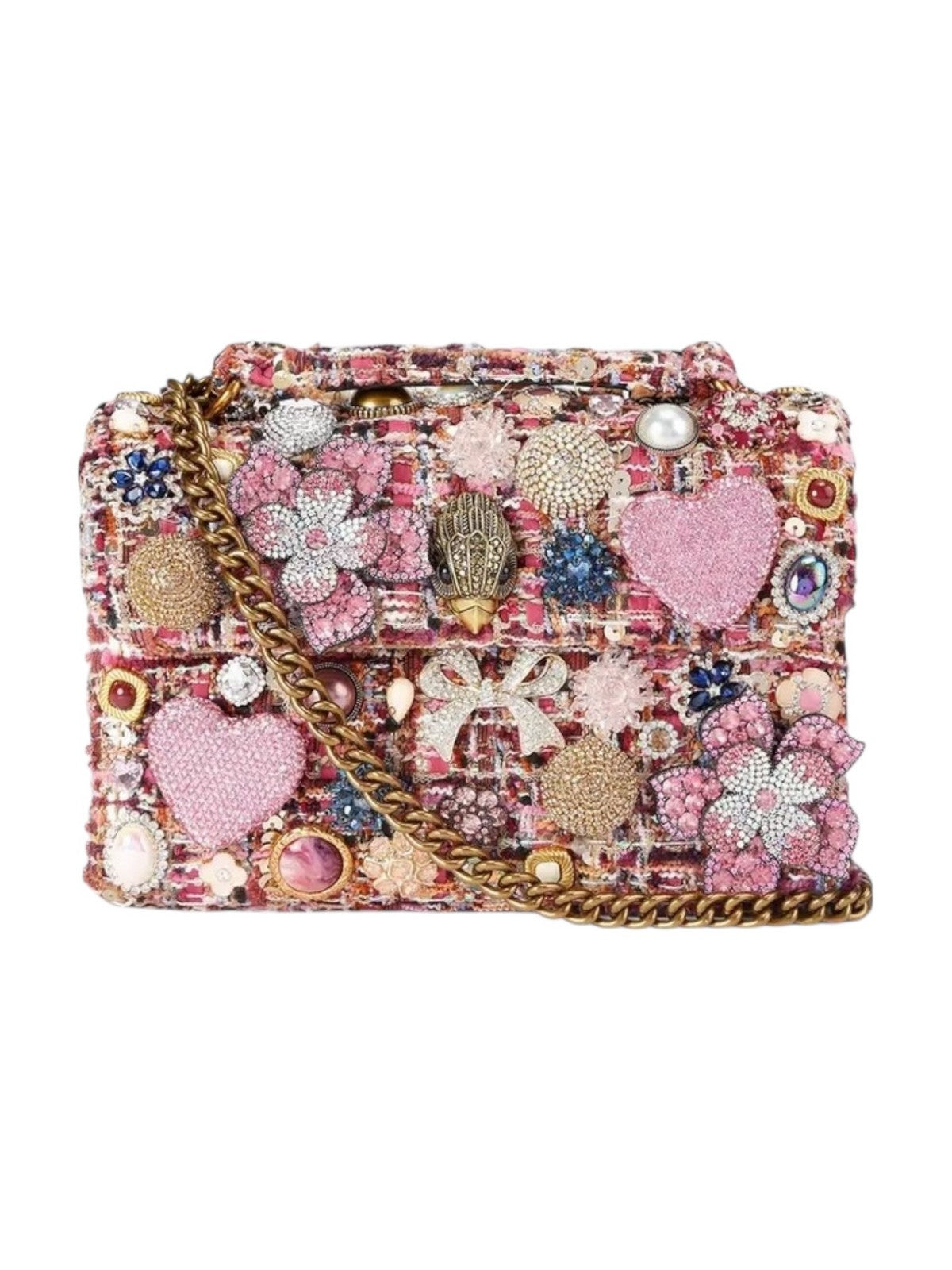 Borsa Kensington KURT GEIGER realizzata in tweed rosa e impreziosita da stravaganti ciondoli 3D, tra cui fiocchi, fiori di perline, cuori di cristallo e pietre.