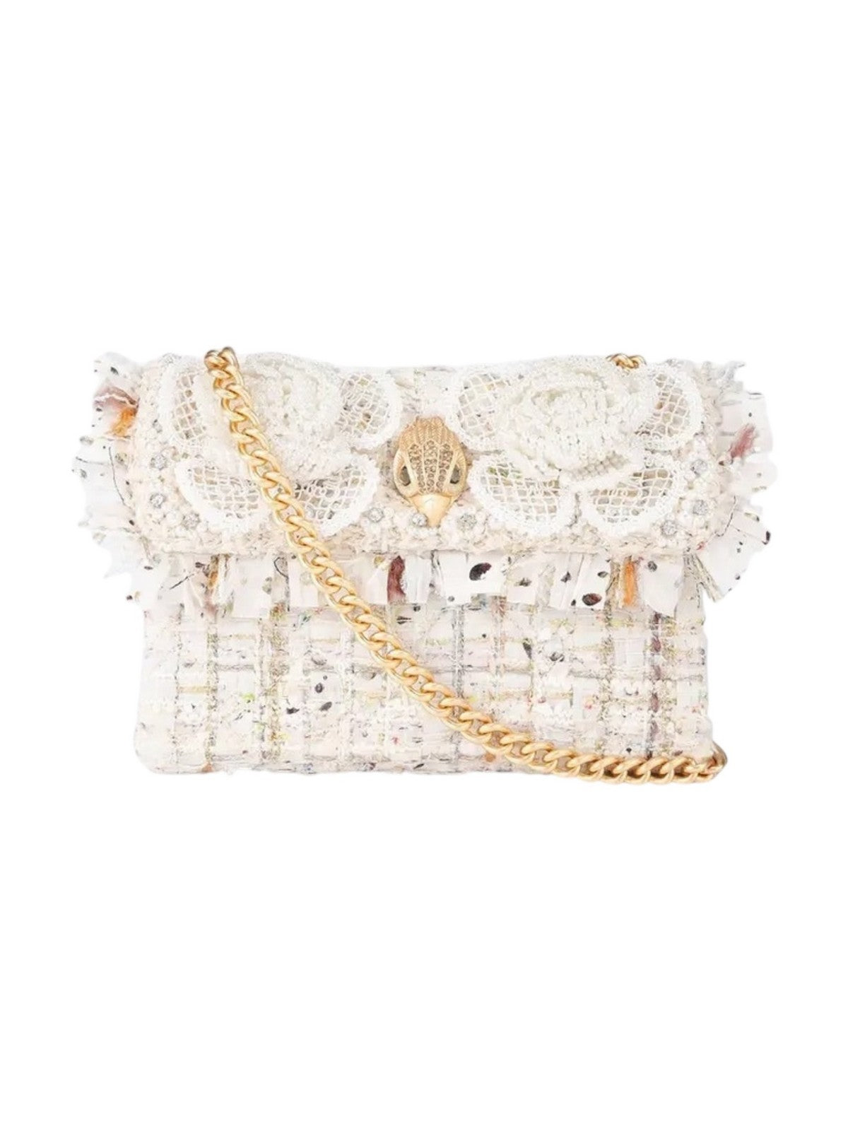 Borsa Kensington Mini in Tweed KURT GEIGER realizzata in tessuto tweed color osso. La patta frontale è impreziosita da due fiori in perle sintetiche e da una testa d'aquila in oro spazzolato.