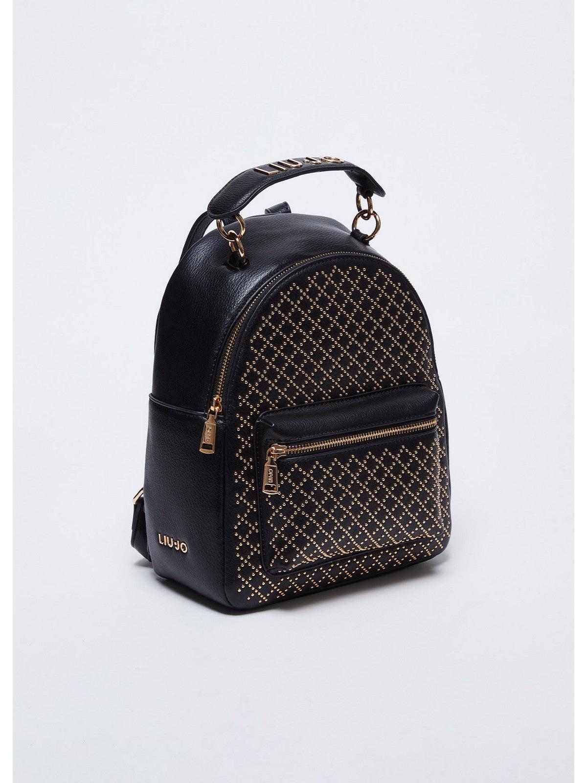 Zaino LIU JO realizzato in PU, con borchie applicate sul fronte all-over. Logo in metallo sul lato e manico con maxi logo in metallo dorato. Spallacci regolabili. Chiusura principale con zip e tasca piccola fontale. Tasca interna